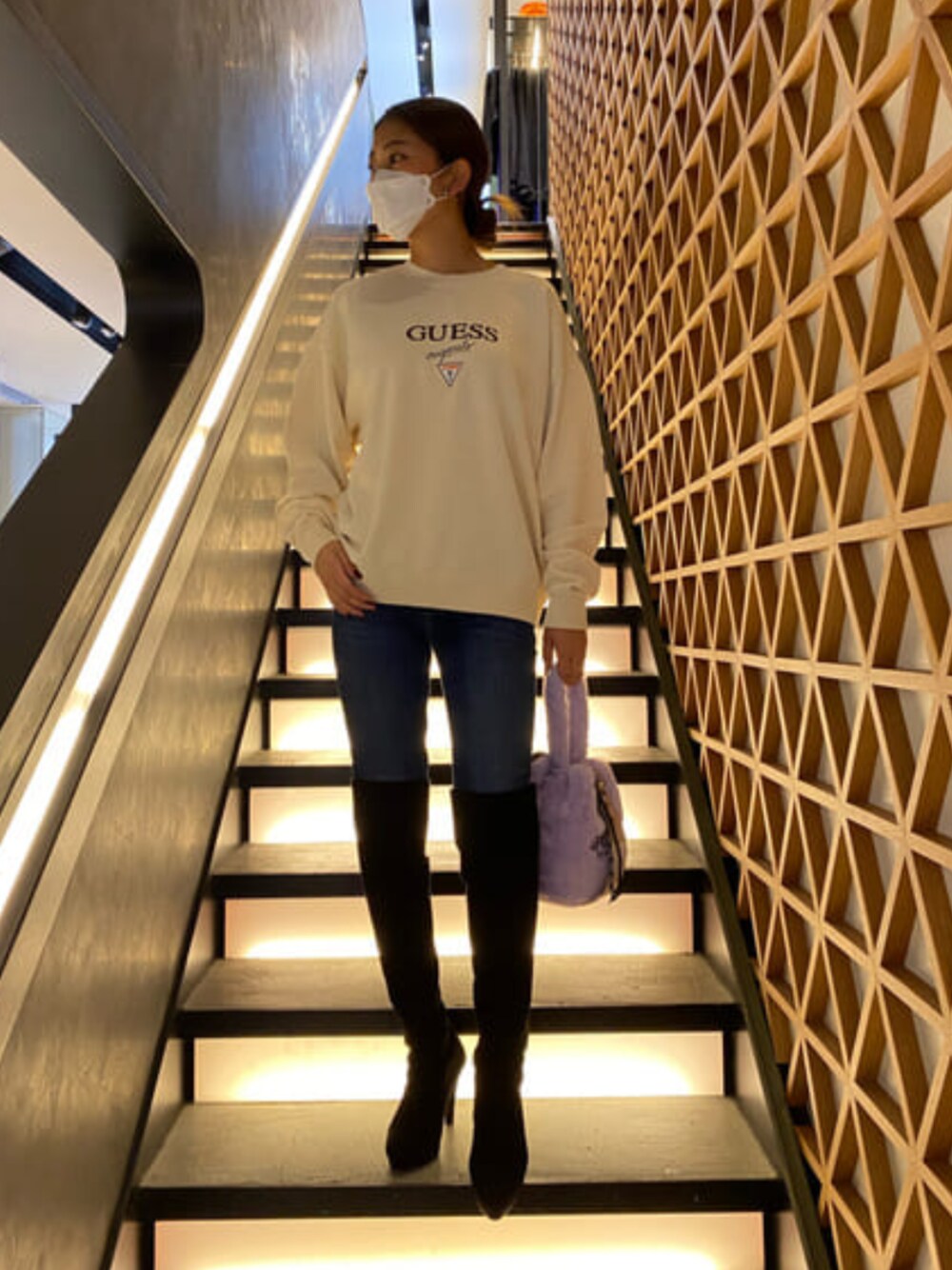 メンズトレーナーでオーバーに ハイウエストスキニーとニーハイブーツで 合わせてみました♪