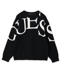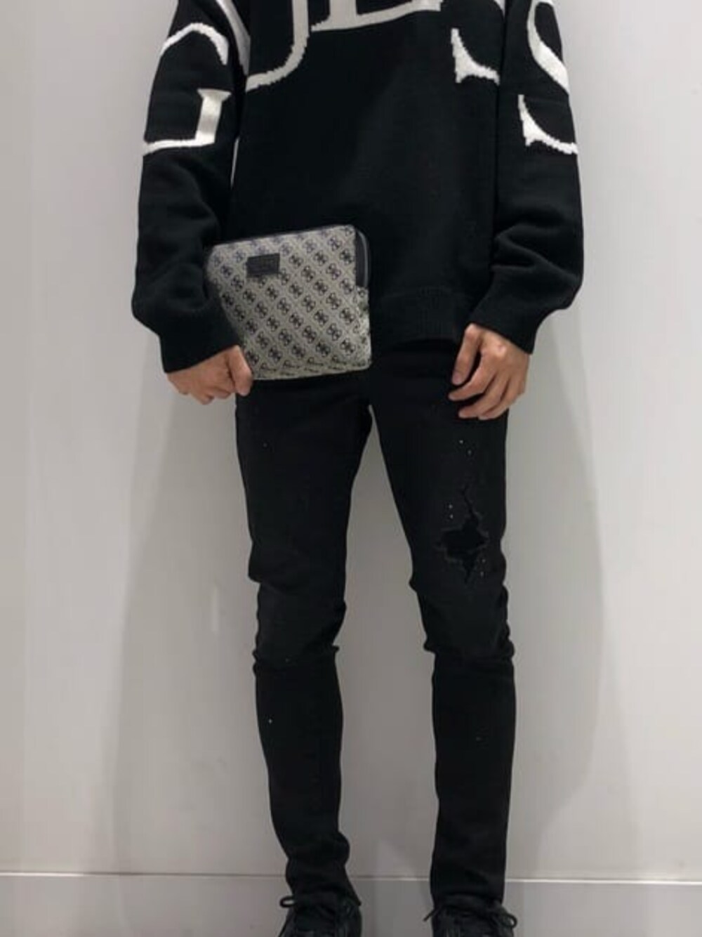 ニット、ダメージスキニーのシンプルなブラックコーデ。 ニットは胸から肩にかけてブランドロゴがあしらわれており、シンプルの色味ながらインパクト大です。 ショルダーバッグはベルト部分の色が違う仕様で良いアクセントになっています。