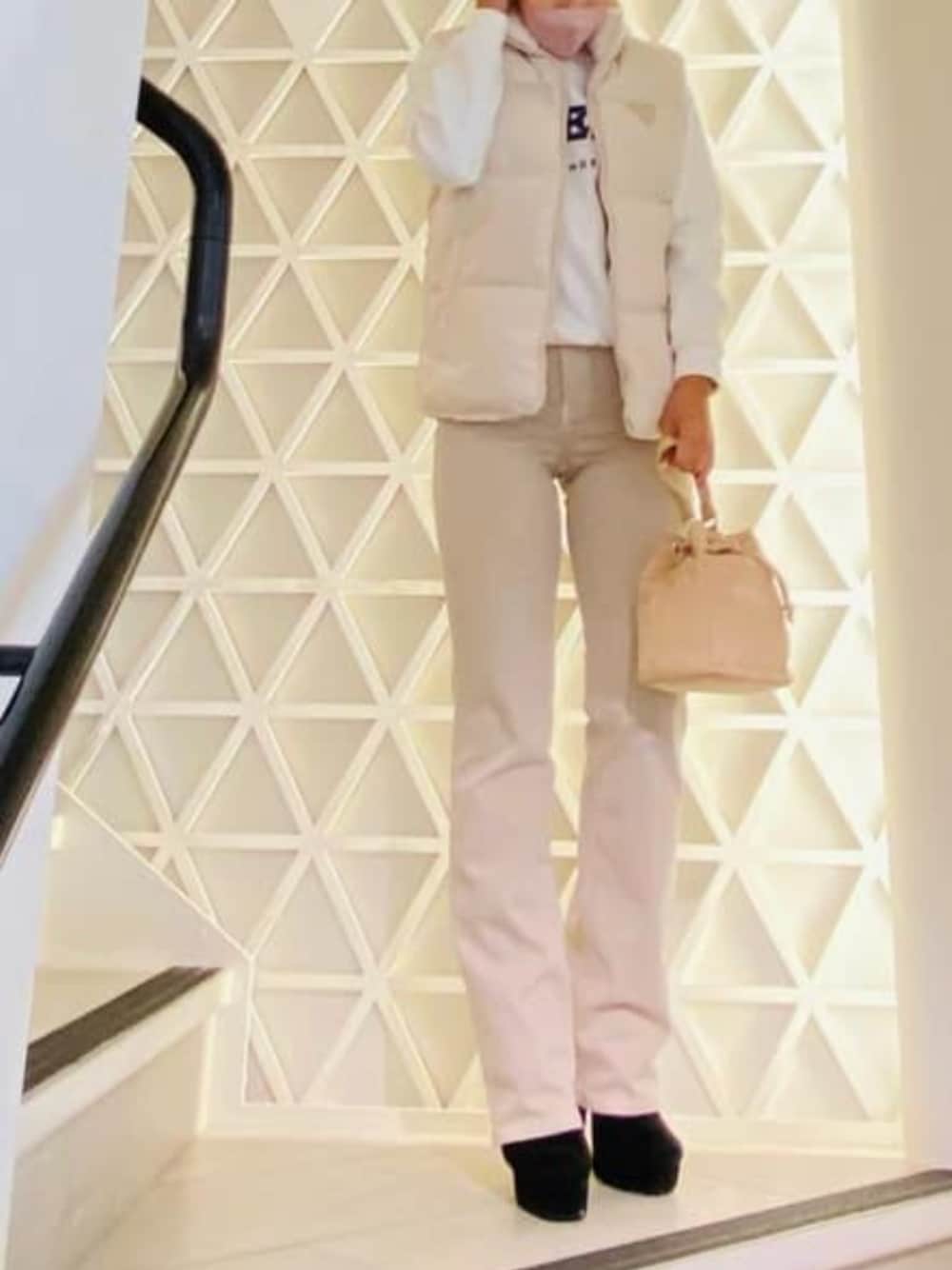 リアルダウンのベストと同系色のデニムを合わせるワントーンコーデです。 ベストはダウン70%入っており軽くて暖かい商品です。首もとにはボアもついています デニムはハイウエストでストレッチが効いており楽に履いていただけます トップスのロゴはデニムになっていてポイントになります