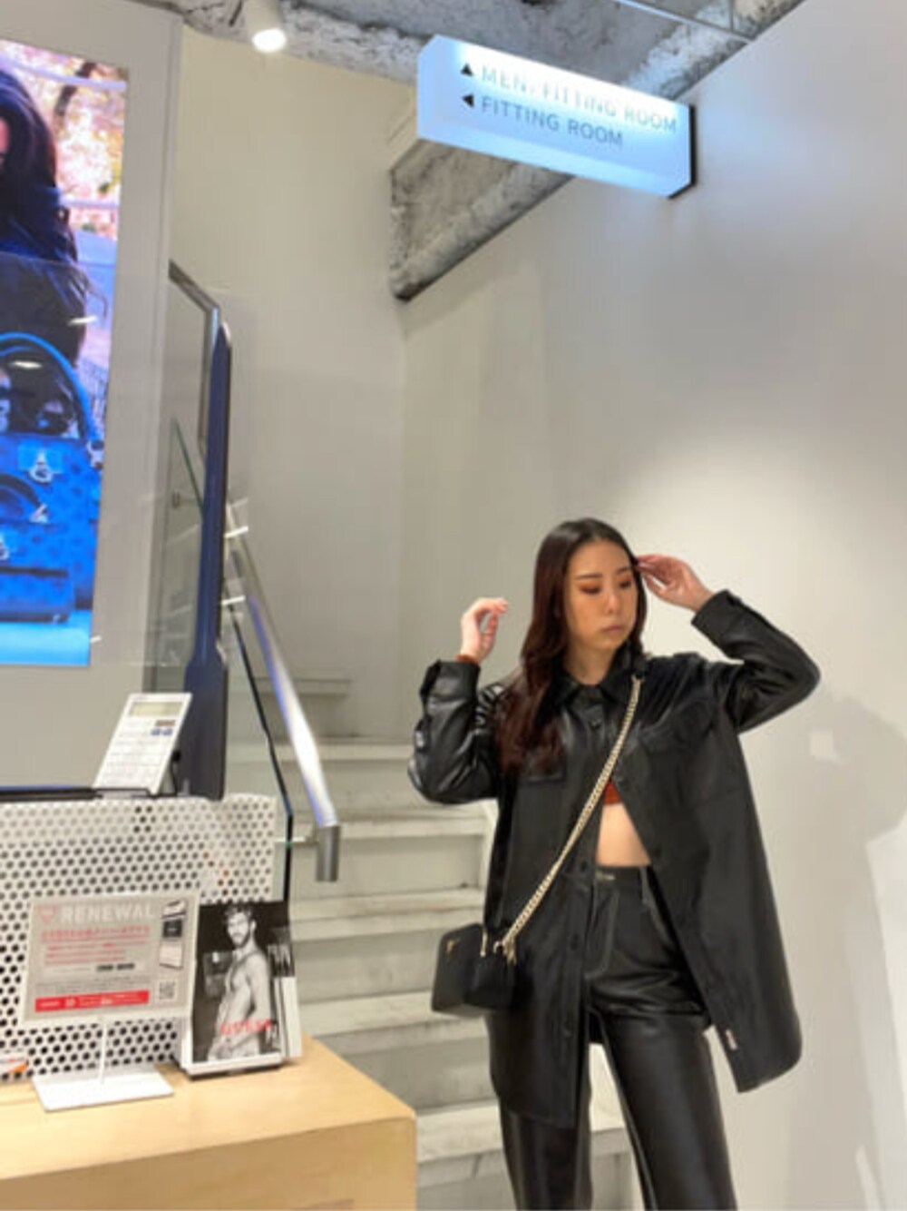 オールブラックのレザーのセットアップで重くなりすぎないよう、ジャケットの前ボタンをアレンジして自分流にコーディネートしました。 ジャケットは大きめに、ボトムスはジャストサイズを選ぶのがポイントです。