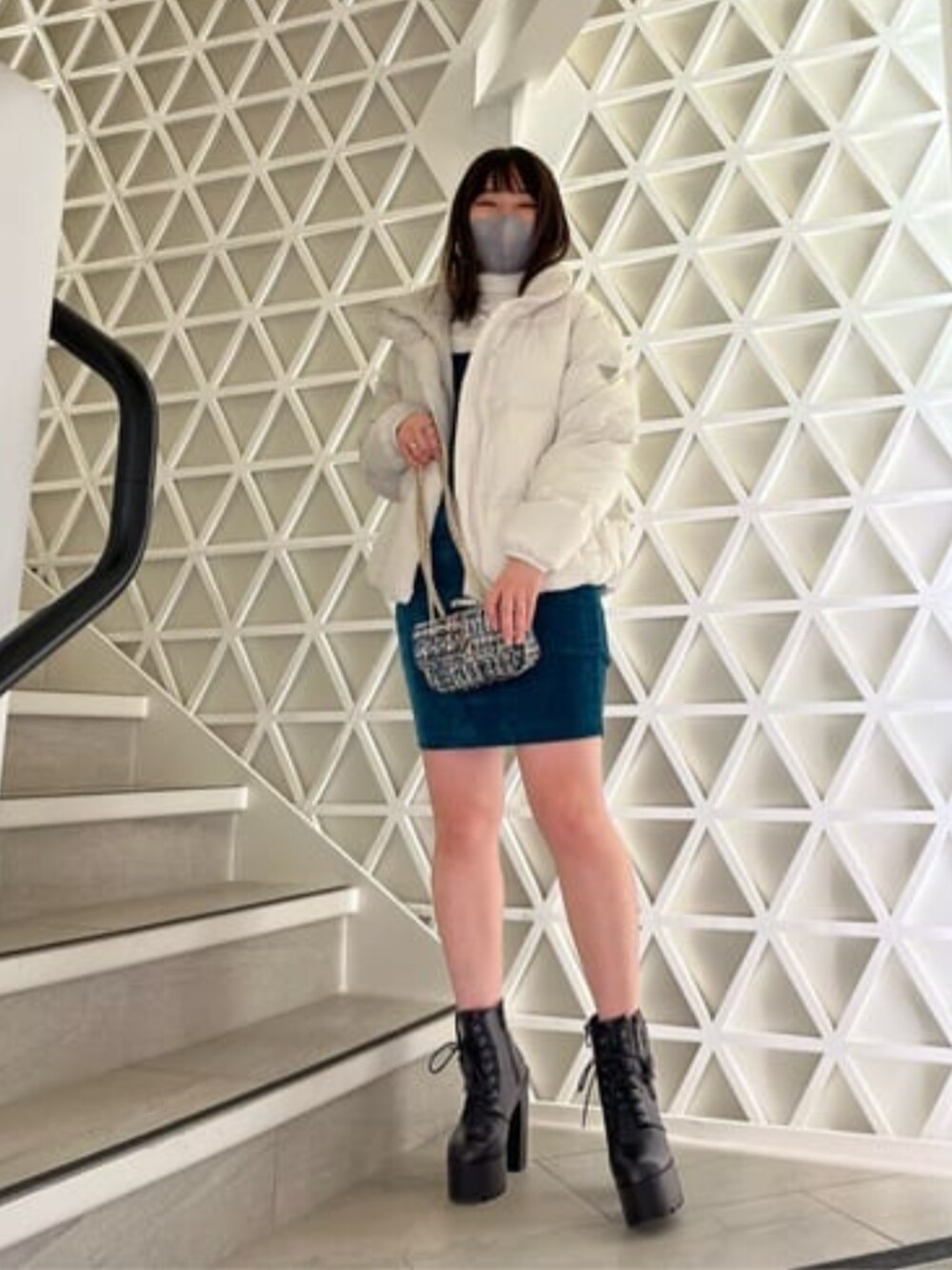 クリスマスも近いので 少しクリスマスぽく◎ ベロアのグリーンドレスはタイトめですが、ストレッチが効いており体のラインをきれいに見せてくれます。インナーを合わせてもいいですが、一枚できると首元が綺麗に見えるのでよりセクシーになります。 バックは、本当におすすめです。 ツイードなのですが色が、少しカラフルで今までにないカラー◎