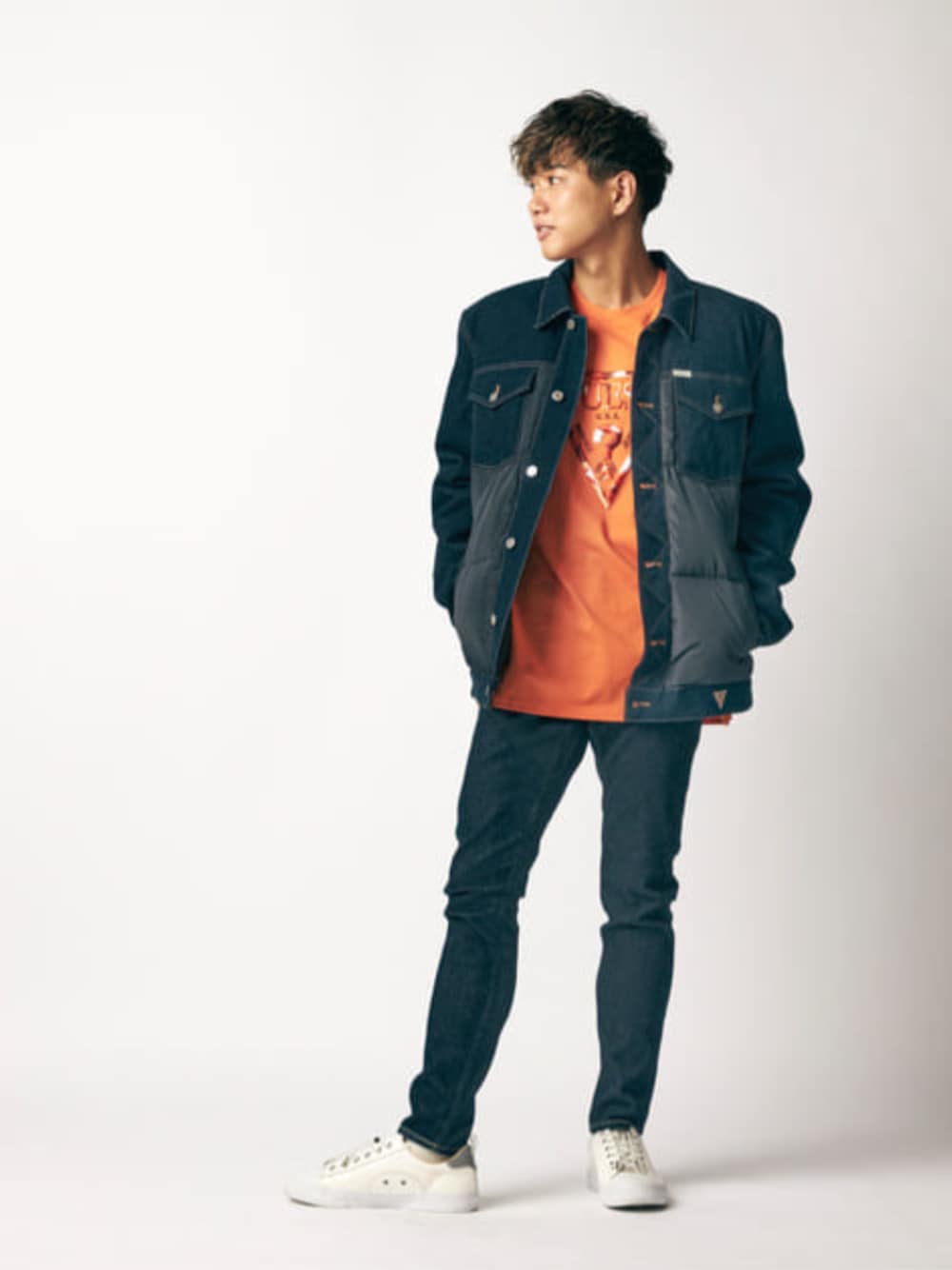デニムオンデニムはGUESSらしさ溢れ出るコーデ! デニムジャケットは中綿で少し厚手なので秋冬で活躍するアイテムです! 異素材が使われてるのでデザイン性があり他にない特徴です! デニムパンツの色味を合わせればデニムオンデニムとして◎ スキニーですがストレッチが効いていて履き心地抜群!冬でも履ける素材になってるので肌に密着してますが防寒性もあります! オレンジで差し色を入れてますがTシャツです! GUESS定番の三角ロゴかと思いきやロゴ部分は刺繍になっていてカモフラというデザイン性です!
