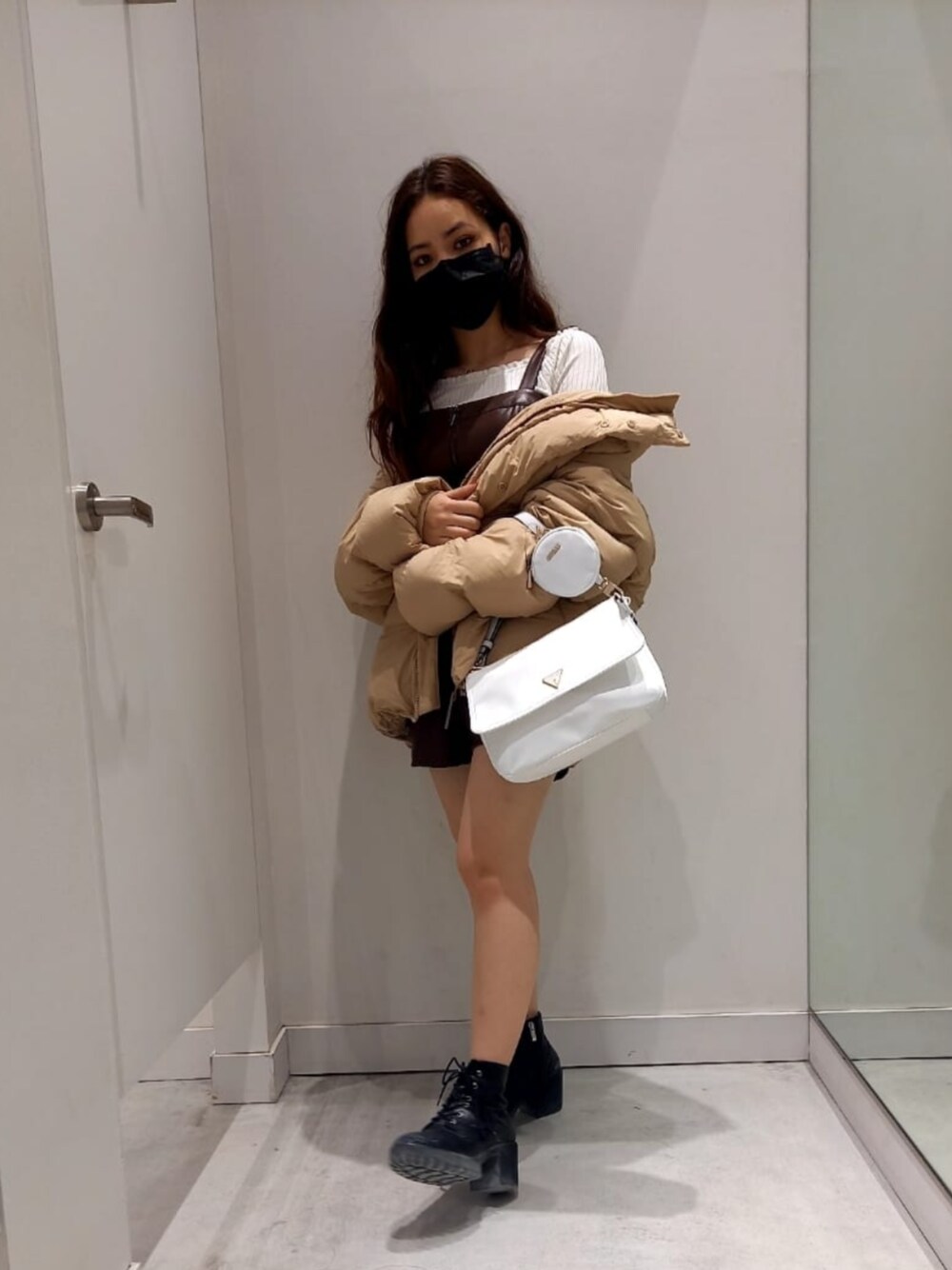 アウターMサイズで着てますがSサイズでもレディース大きめで着れます! 冬の可愛いコーデにしてます! 白いバックでコーデをしめてます。 中のブラウンオーバーオールと違うトーンのブラウンのダウンでオシャレに。