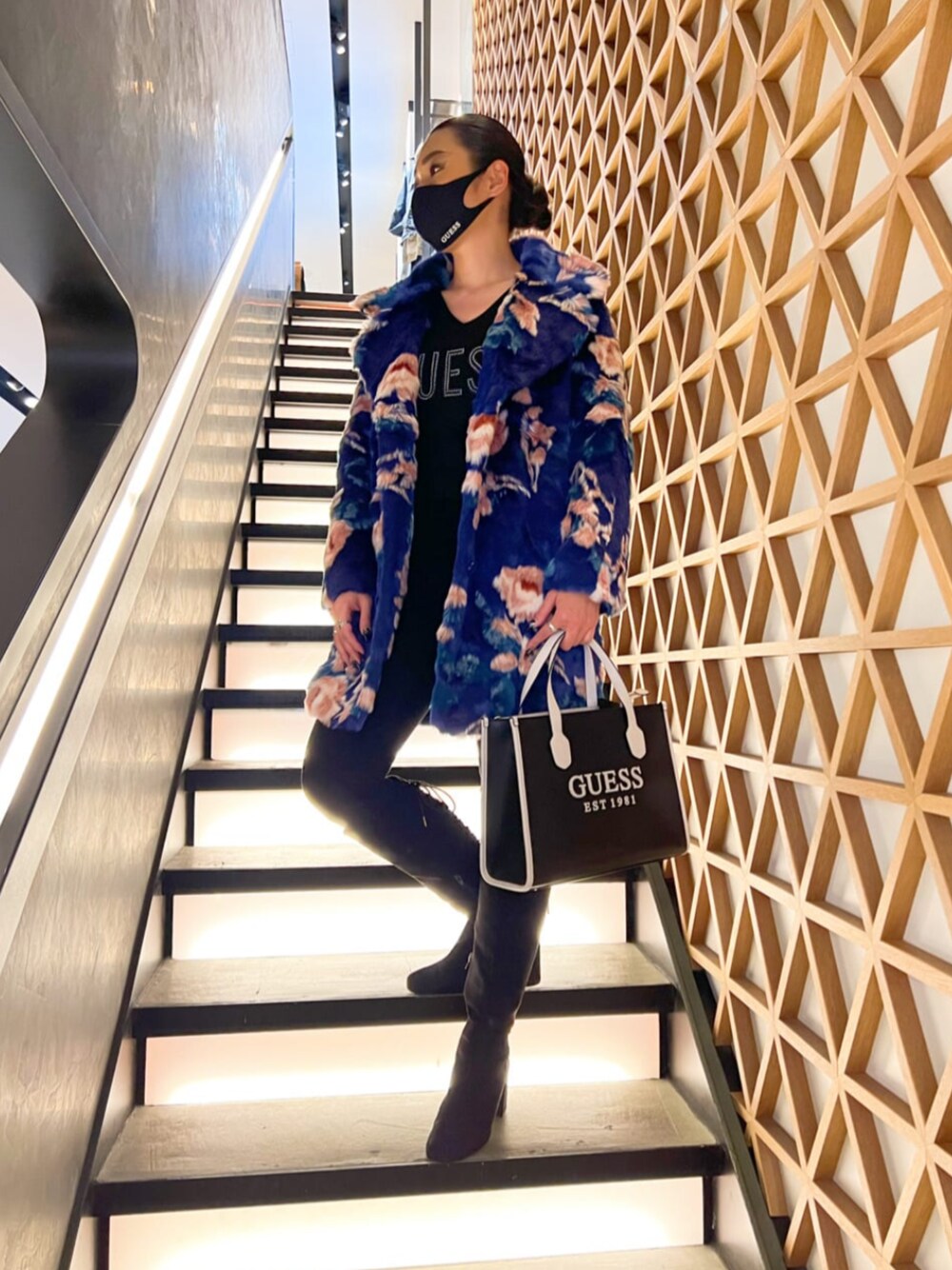花柄が目立つファーコートはドレスにも合います! ブルーのカラーが可愛いです(^^) ブラックスキニーと合わせてスタイルupに! Bagは大人気デザインで、ショルダーヒモ付きなので使いやすいです! 荷物もたくさん入ります!!