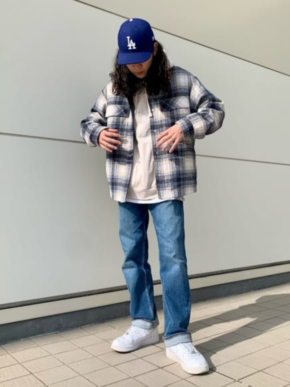 ストリートカジュアルコーデ パーカーは裏起毛で秋冬仕様。 チェック柄のジャケットは裏地が中綿キルトになっているので、薄手ながら暖かいのがポイント デニムの形はストレートで幅色い年齢の方にもオススメ!