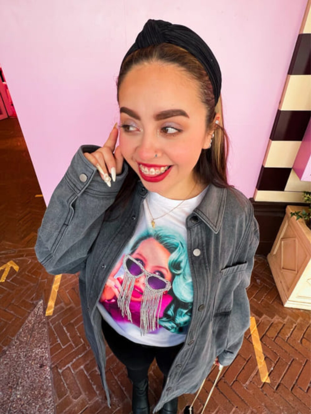 シンプルコーデ⭐︎ キラキラサングラスをした女性のプリントがポイント‼︎シンプルコーデも鮮やかにさせる一枚‼︎ ゆったりサイズなので着心地GOOD◎ デニムジャケットはメンズアイテム‼︎ オーバーサイズで着れるのでおすすめ◎