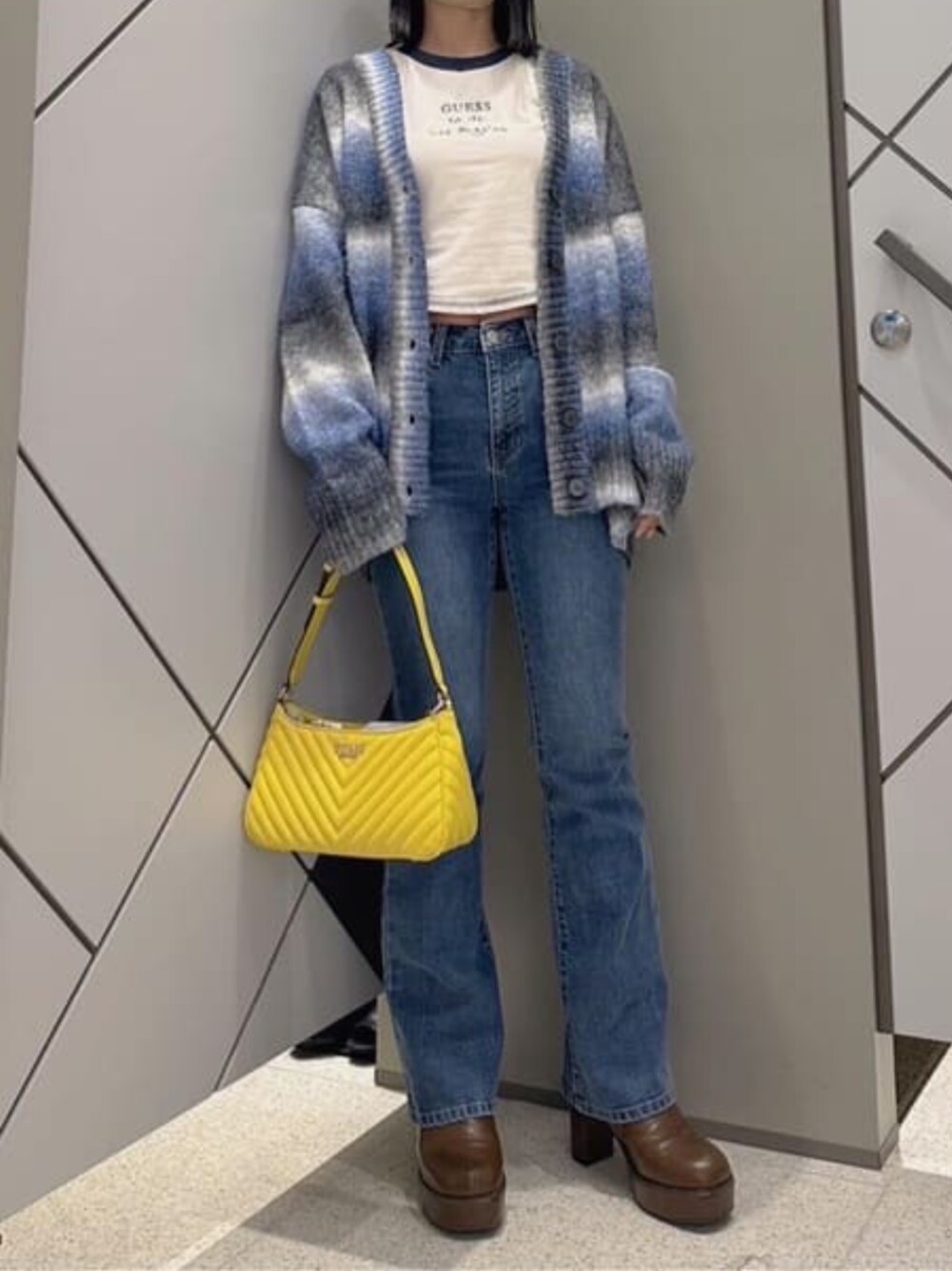 グラデーションカラーがアクセントになるカーディガンはオーバーサイズでルーズなシルエットです。 ブルーデニム合わせで、シンプルなコーディネートにビビットなカラーのハンドバッグもおすすめです! ルーズなカーディガンとバランスが取れるように、中に着ているTシャツはタイトめでクロップ丈を選びました!