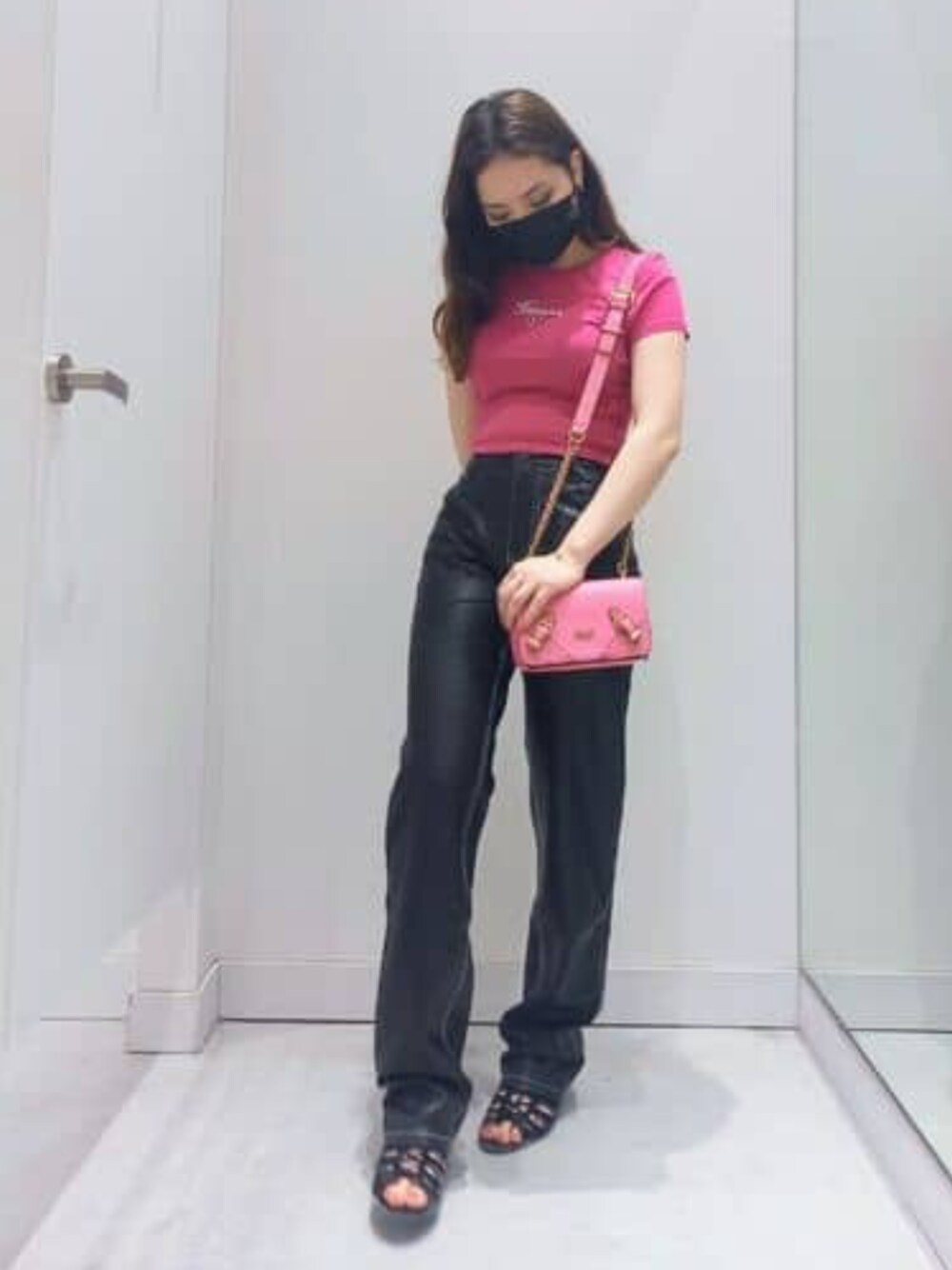 ポップカラーとしてピンクのTシャツに色の近いピンクのバッグでオシャレなコーデになってます。 レザーパンツはカーペンターですごくかわいいです!