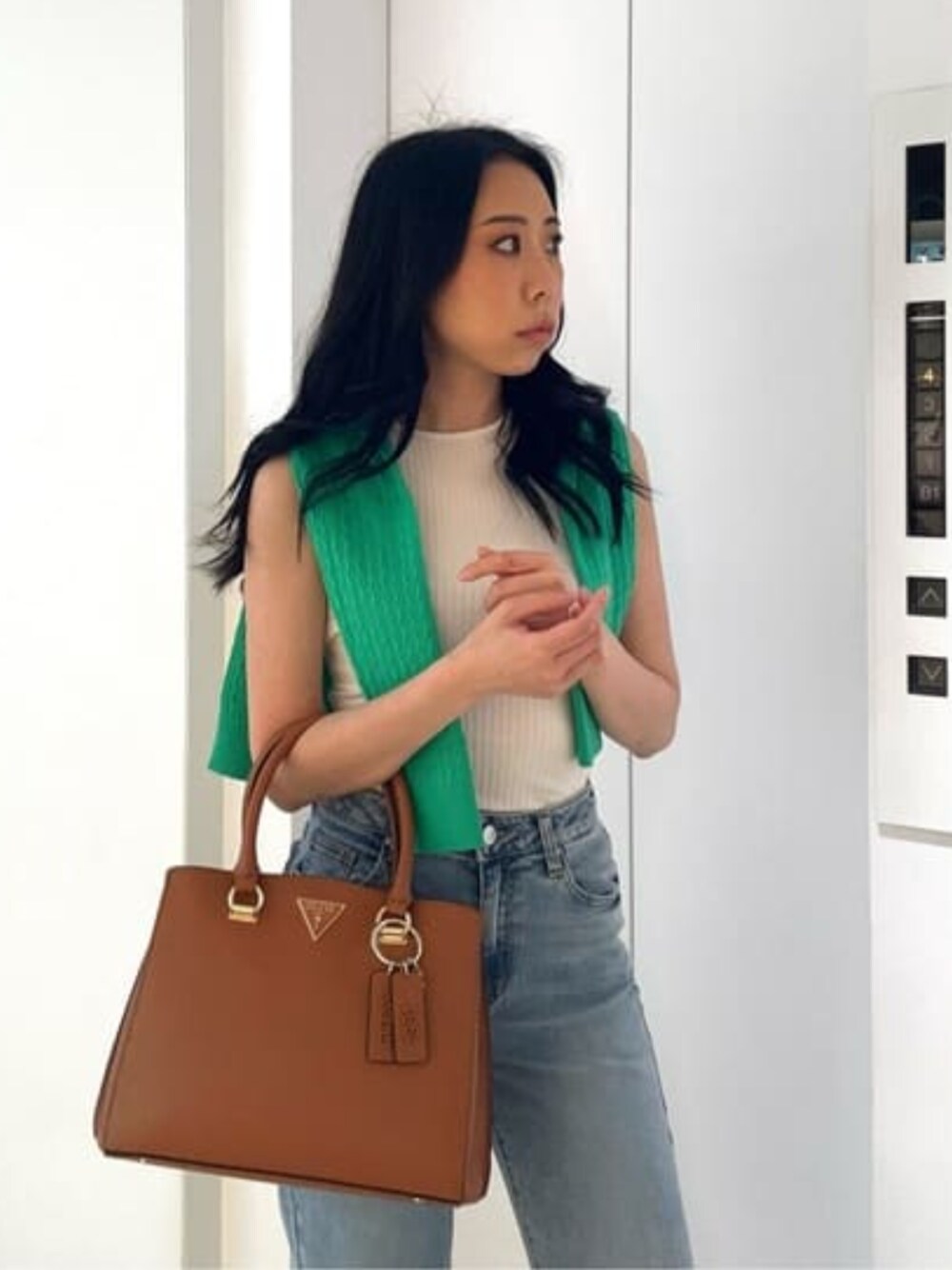 シンプルなトップスに、差し色のカーディガンを肩掛けしました。 グリーンがポイントです。 全体的にシンプルにコーディネートしました。