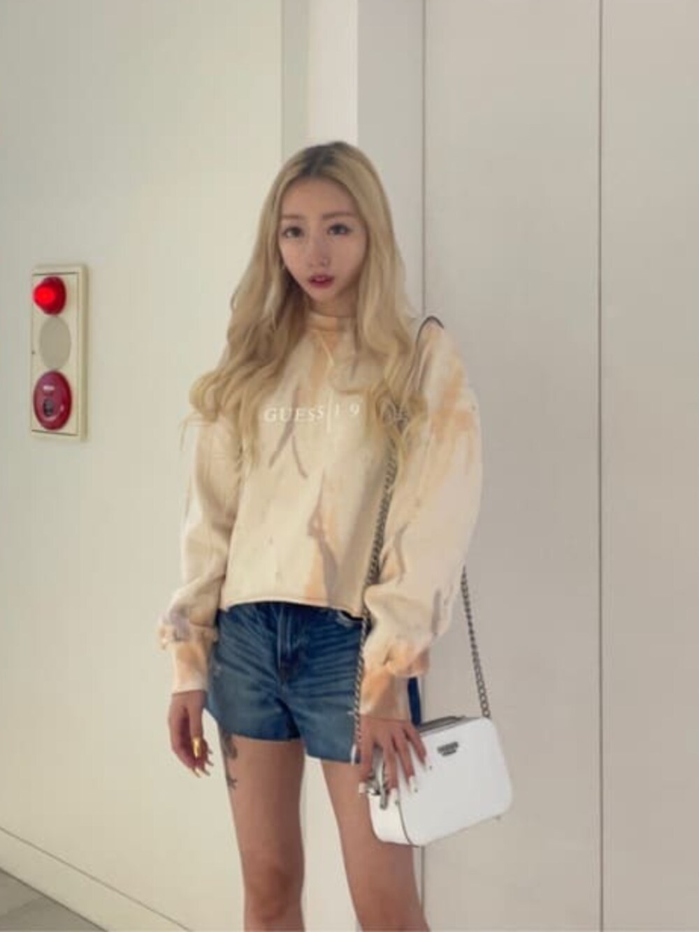 新作のスウェットにショートパンツを合わせ、GUESSの定番のボックスバックを使用しました。