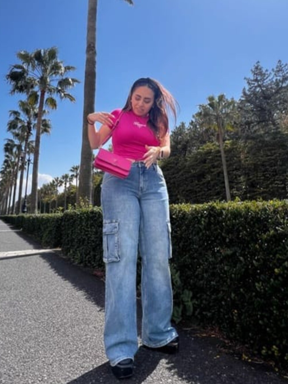 ピンクがポイントのシンプルコーデ⭐︎ デニムは少し長めだけどスニーカーと合わせるのがオススメ◎ 小さめのトップスと合わせるとGOOD◎ この夏は愛用決定⭐︎