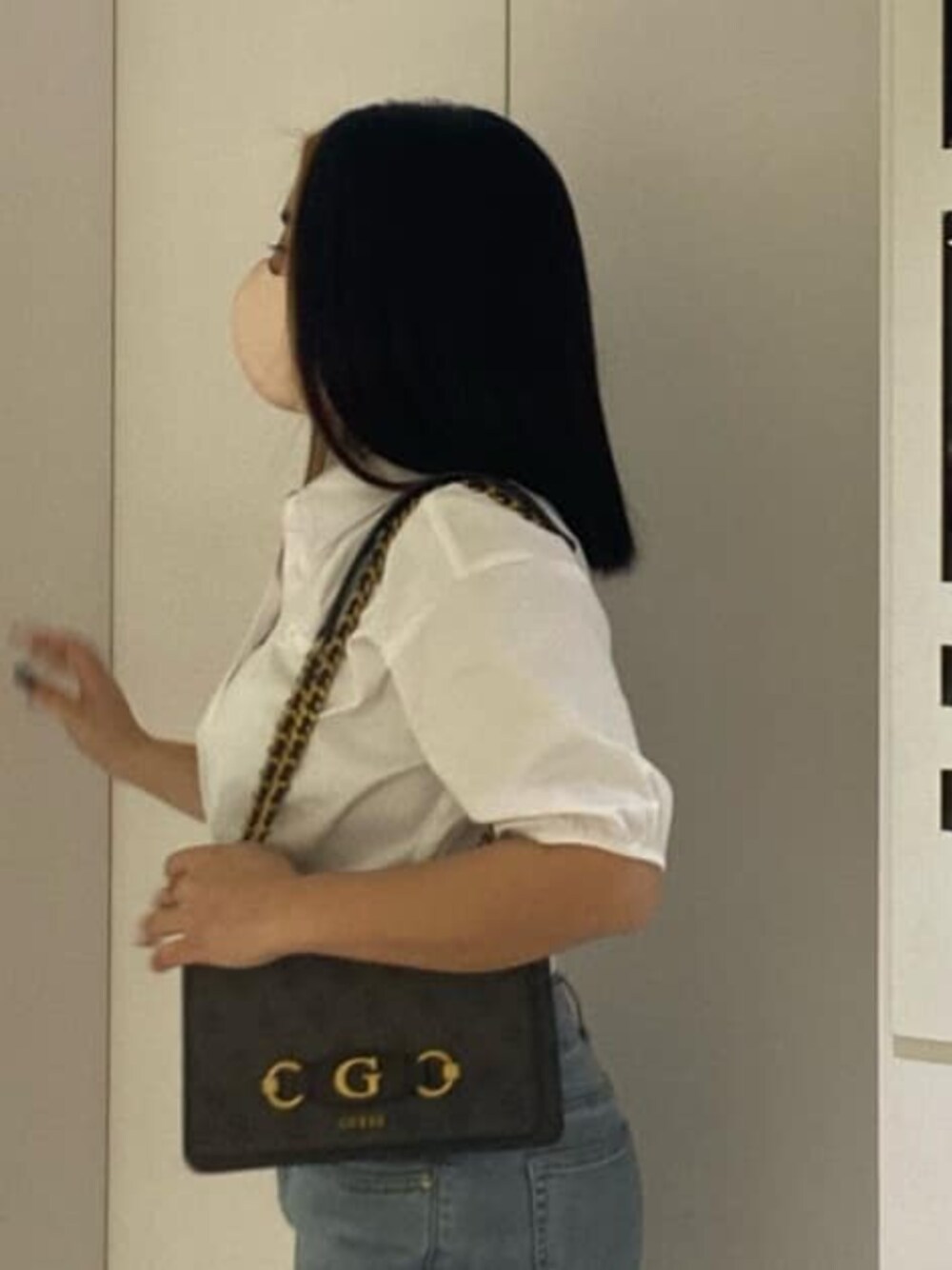 大人っぽいコーデです。 ホワイトブラウスとデニムの組み合わせでシンプルに仕上げました。 そこに黒とゴールドのディテールが入ってるバッグを合わせてさらに大人っぽさ増し増しです(アゲアゲ)♡