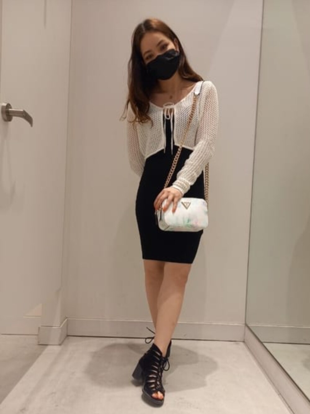 タイトドレススタイルアップ効果! 腕気になる方はカーディガンと合わせるのオススメです! シンプルコーデでバッグは何でも合わせやすいです。
