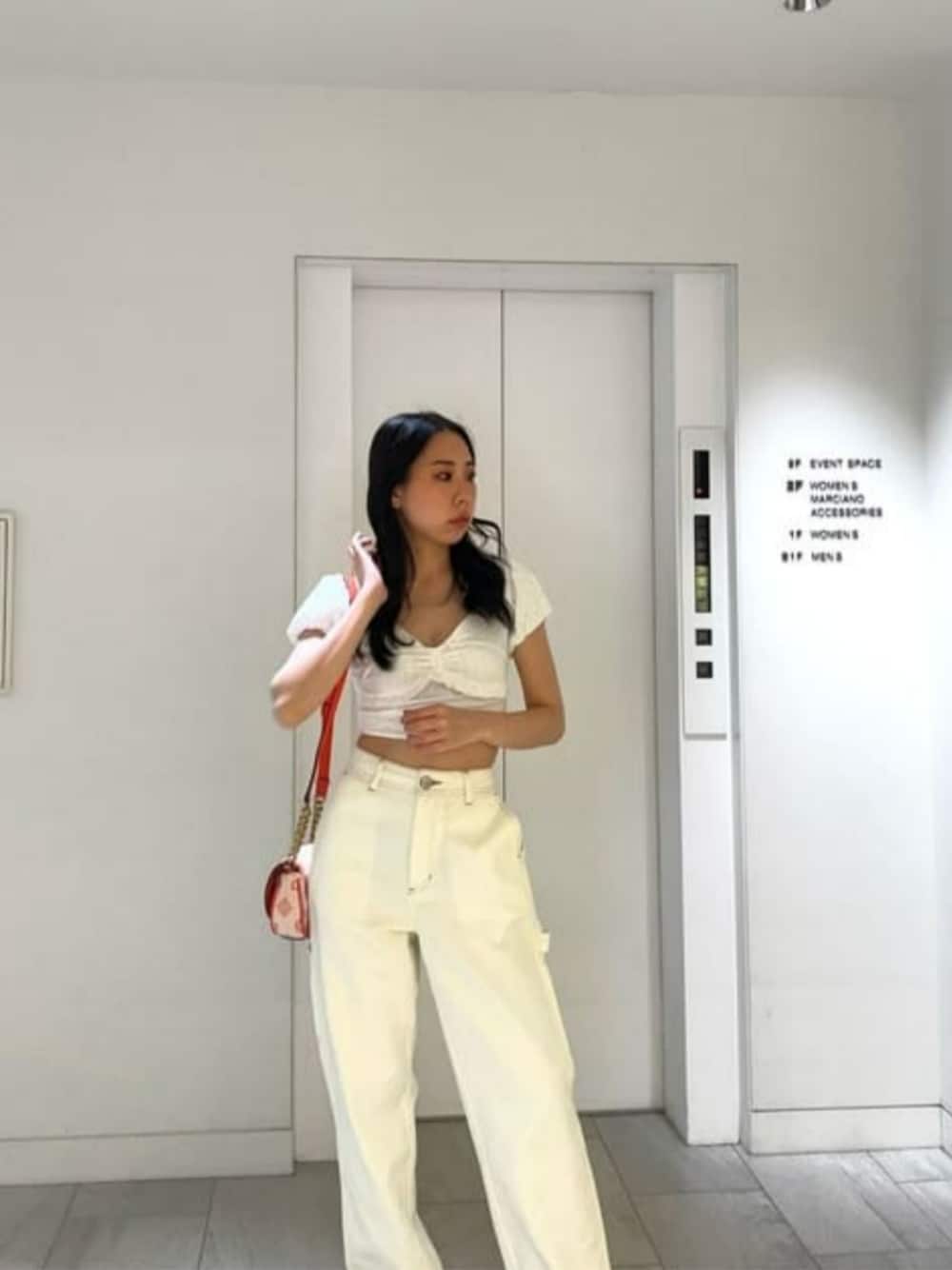 トレンド感のあるトップスを、メンズのカーペンターデニムに合わせてカジュアルにコーディネートしました。 オールホワイトコーデの締め色はオレンジ色を選んで夏らしくしました。