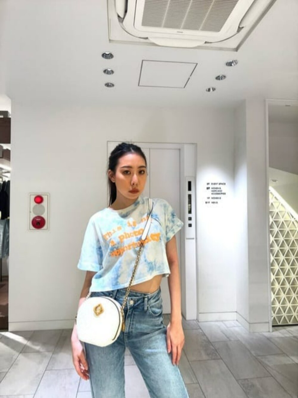 夏に着たくなるタイダイ柄のTシャツ。 袖の折り返しも、丈感も可愛いです。 デニムは斜めウエストなので、スタイルアップ効果があります。 大人気の丸型ショルダーはキルティングデザインがポイント。