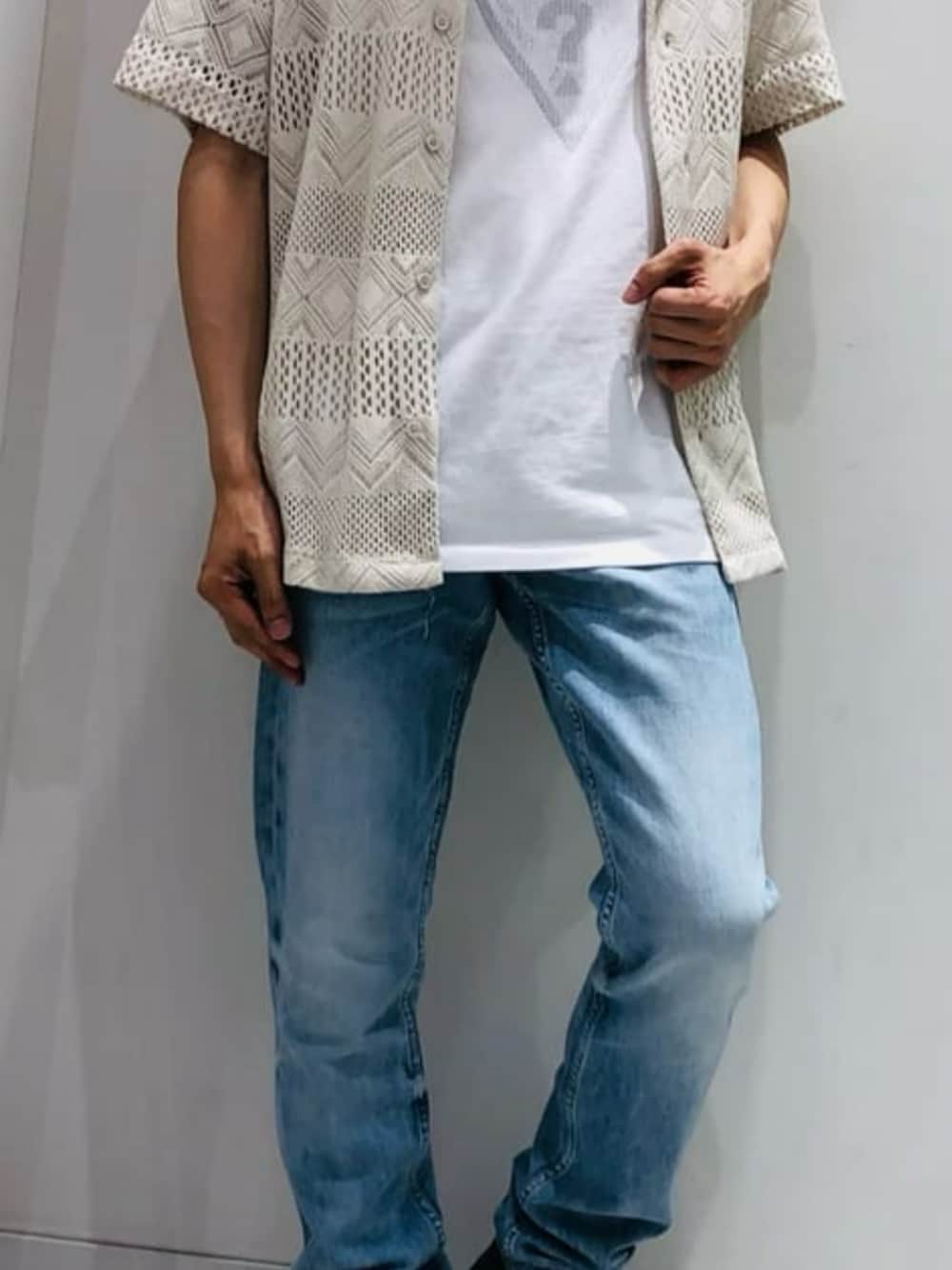透け感のあるクロシェ編みのシャツに、定番ロゴTシャツを合わせたコーデ。Tシャツは角度によってデザインが変わる仕様で、一枚でもインナーでも使えるアイテムです。