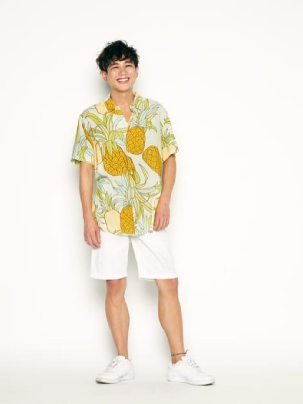 夏らしいパイナップル柄シャツは1枚で決まるアイテムで夏にもってこい! リゾート地や海コーデにピッタリです! インナーにTシャツやタンクトップと合わせても◎ 個人的にはボトムスをホワイトと合わせるのが好きです!