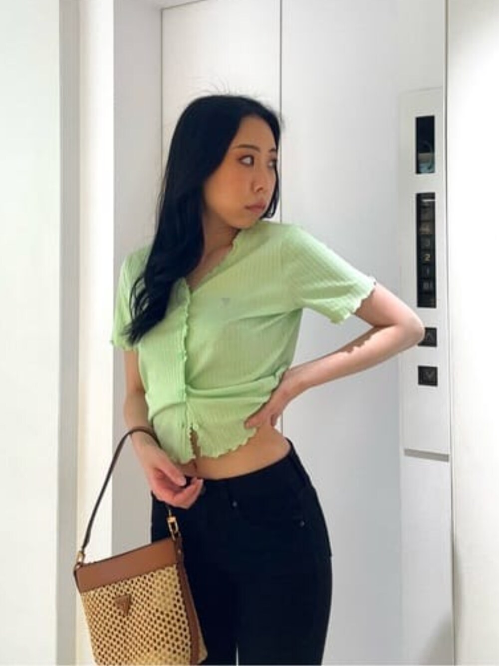 ミントカラーのトップスはボタンを調節して、短めに着てみました。 ブルーのデニムはもちろん、ホワイトやブラックと合わせても可愛いです。