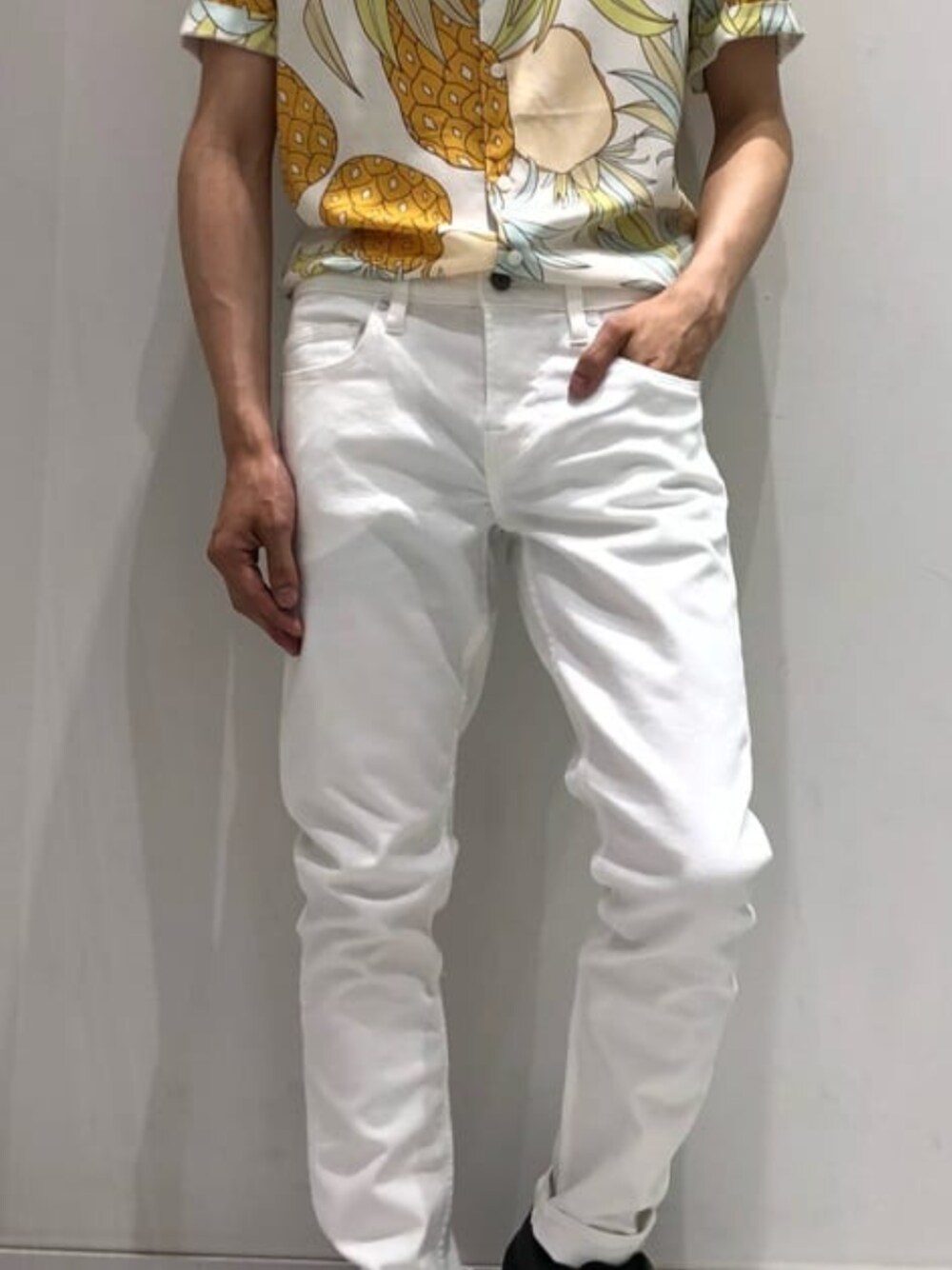 パイン柄のレーヨンシャツに白のスキニーデニムを合わせた夏コーデ。清潔感のある白いデニムはコーデをシックに見せてくれるのでおすすめです。