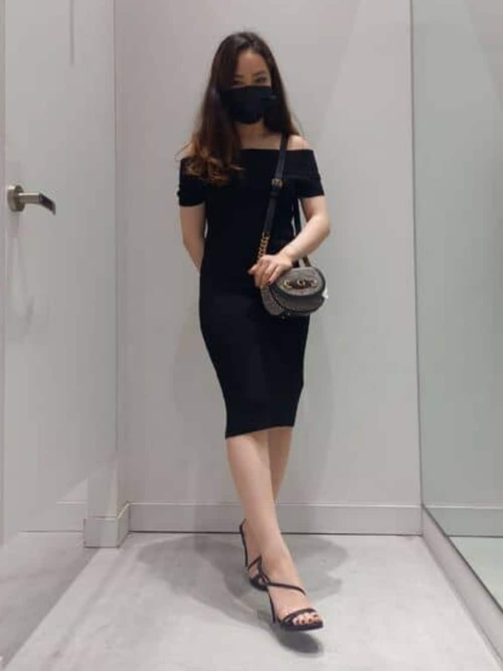 黒のタイトドレス、スタイルアップ効果! 細く見せてエレガントに着れます。 オフショルダーじゃなくても着れますけどオフショルダーにすることでセクシーで女性らしく着れます。
