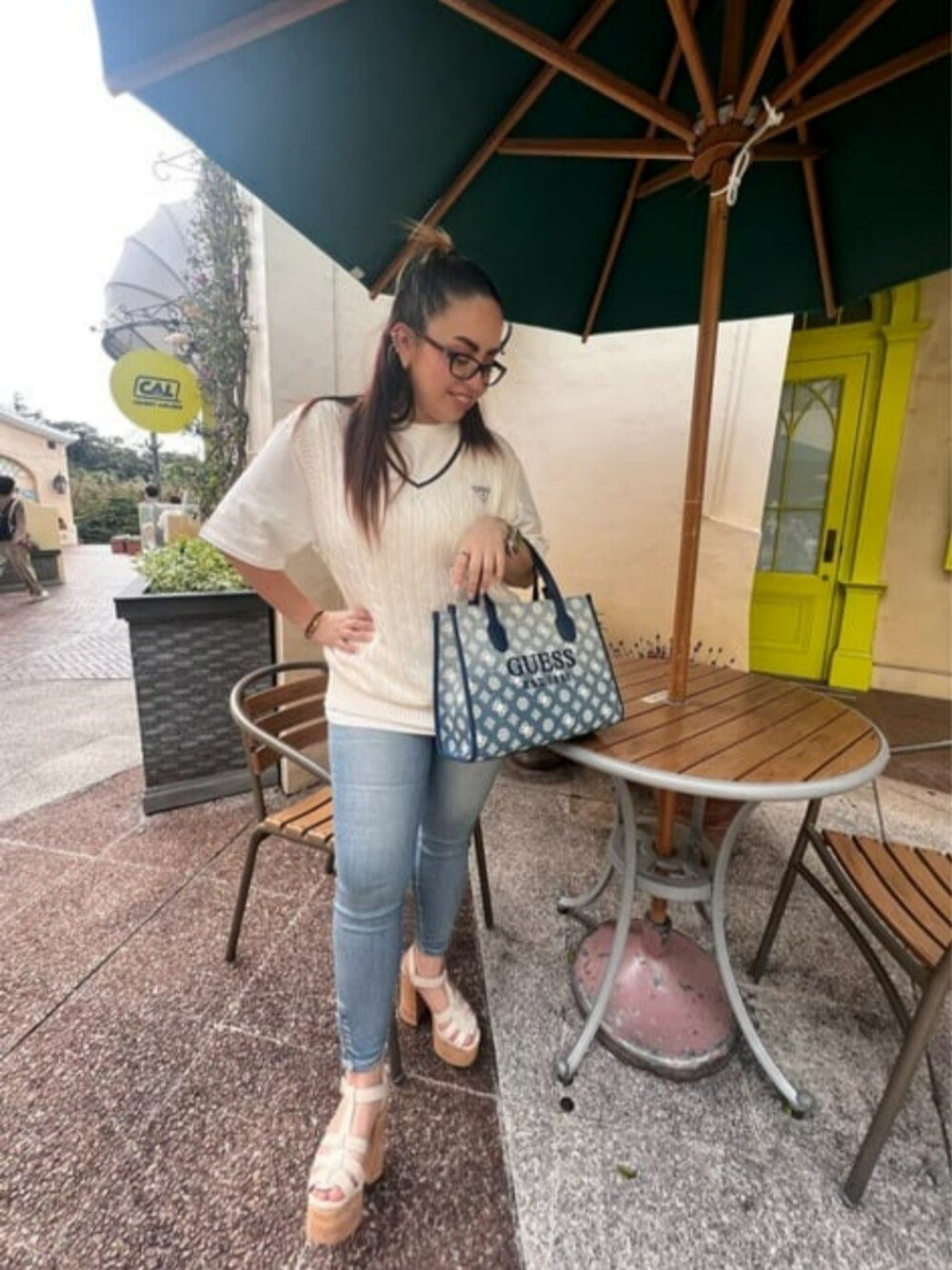オフィスカジュアルコーデ⭐︎ ニットのベストとデニムの相性GOOD◎ 大容量のデニムトートバッグは働く女性にもママさんにもオススメ◎