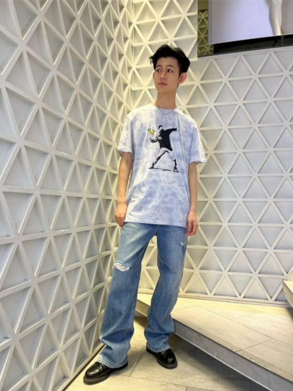 今回着用しているBANKSYのTシャツは、 サイズ感も丁度よくユニセックスなので、 男女問わず着て頂けます! デニムは、丈長めのダメージデニムで、 ウエスト辺りと裾部分は、色落ちの加工が施されているところがオススメポイント✨ 何のトップスでも合うので是非!!