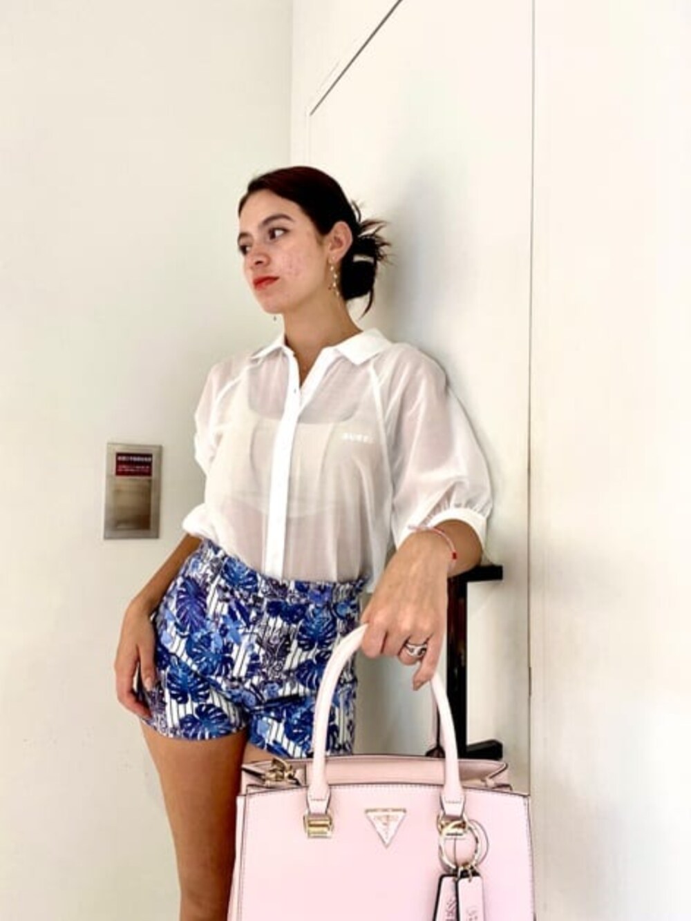 白いブラウスにハイウェストのショートパンツにピンクのハンドバッグを合わせてフェミニンなコーデを組んでみました。 ≪着用サイズ≫ ブラウス XS Tops. XS Short pans 27inch