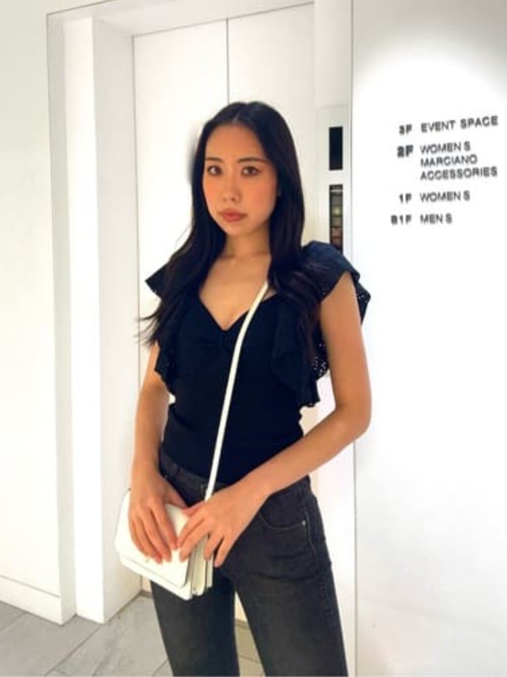 袖のフリルを強調させるため、デニムはフィット感のあるものを選びました。 全体のシルエットが綺麗に見えるよう意識しました。 オールブラックなので、バッグは夏らしいホワイトで涼しさをプラスしました!