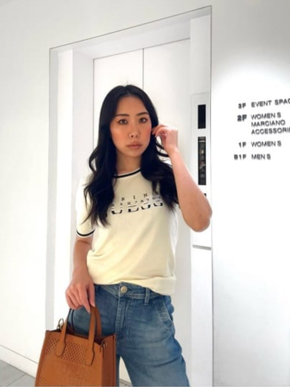 GUESS JAPAN(GUESS JAPAN)のトートバッグ「KATEY Perforated Mini Tote」を使ったコーディネート