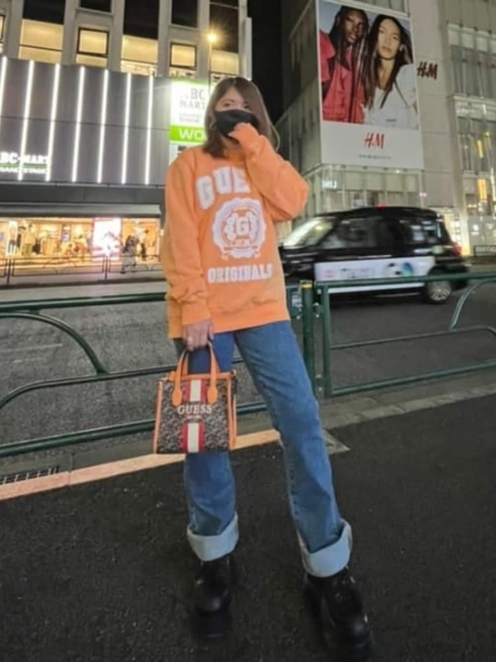 バッグの色もリンクさせたオレンジコーデ♡ オーバーサイズのトレーナーにストレートデニムは相性抜群です◎