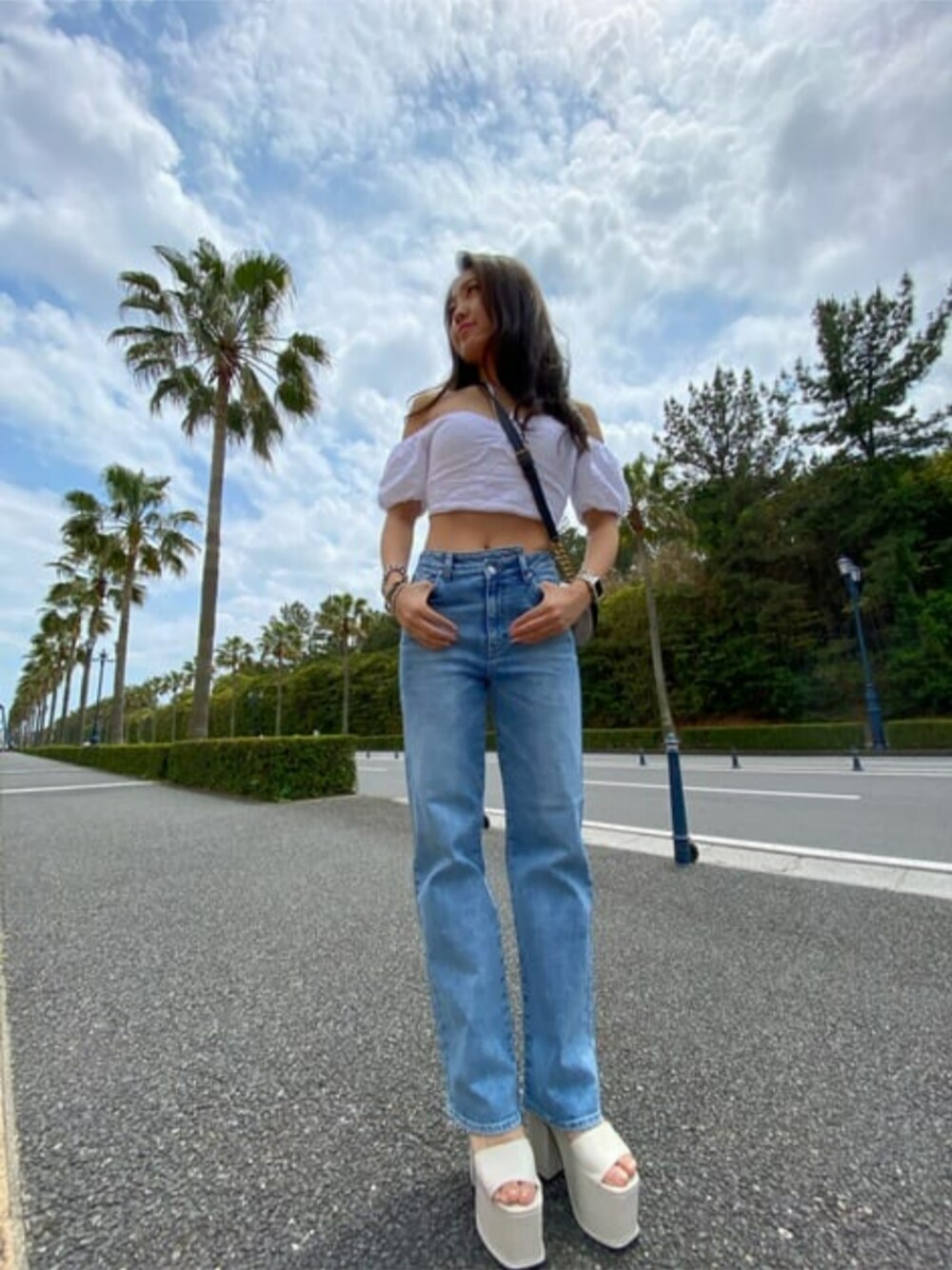 白✖️denim=夏コーデって公式があるくらいに夏はこの組み合わせが着たいよね バンドゥ風のトップスは夏らしいブルーのご用意もございます♡二の腕カバー且つデコルテ部分がsexyで言うことナシ クロスフロントのデニムを合わせて一風変わった私をお届けできるcoordinate 小さめなのにチェーンやおしゃんな柄で存在感を放っているミニバッグも超おすすめアイテム 左ハンドル片手で運転しますよ助手席乗車者募集中