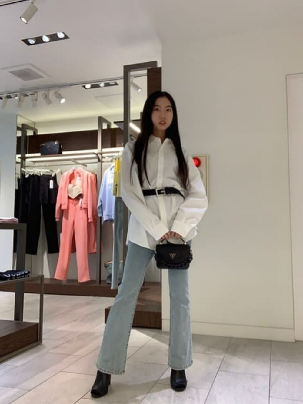大きめのブラウスにベルトでアクセントをつけました。カバンと靴の色も合わせることで統一感のあるコーディネートになります!
