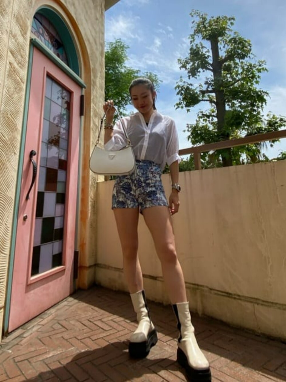ストレッチ最強の夏らしいショートパンツが主役のcoordinate🌺 動きやすさが満点なのでビーチバレーできます シアーシャツが涼やかでしょ WhiteとBlueコンビはサマーコーデに必須