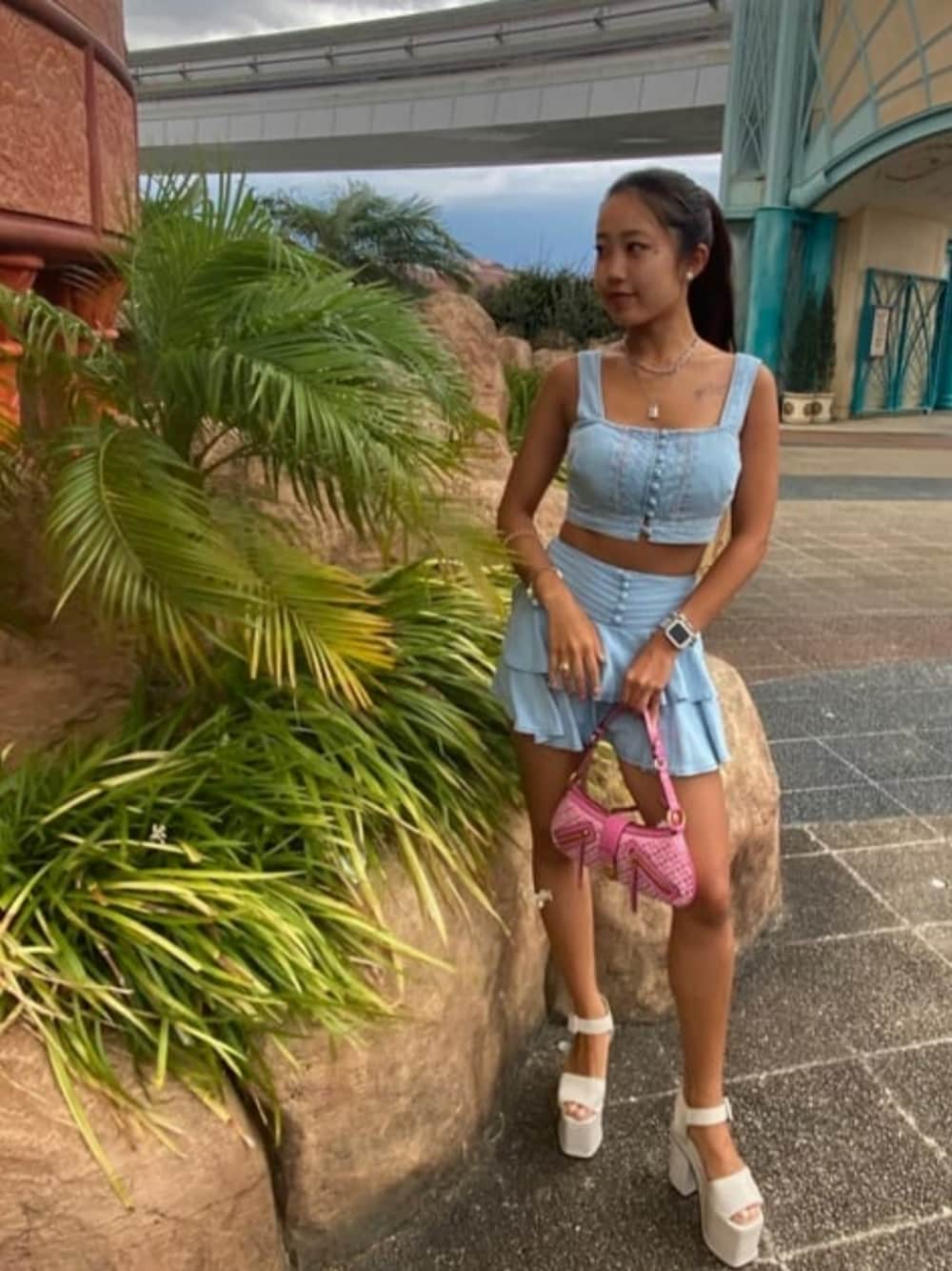 日焼け肌にはこちらのライトカラーデニムセットアップ;) 女の子感炸裂のフレアスカートが可愛い<3 背中開きがhealthy🌞 スタイルアップ乞うご期待です🌈✨ bagには今年のカラーであるpinkを投入して気分はBarbie🎀♡映画見てね