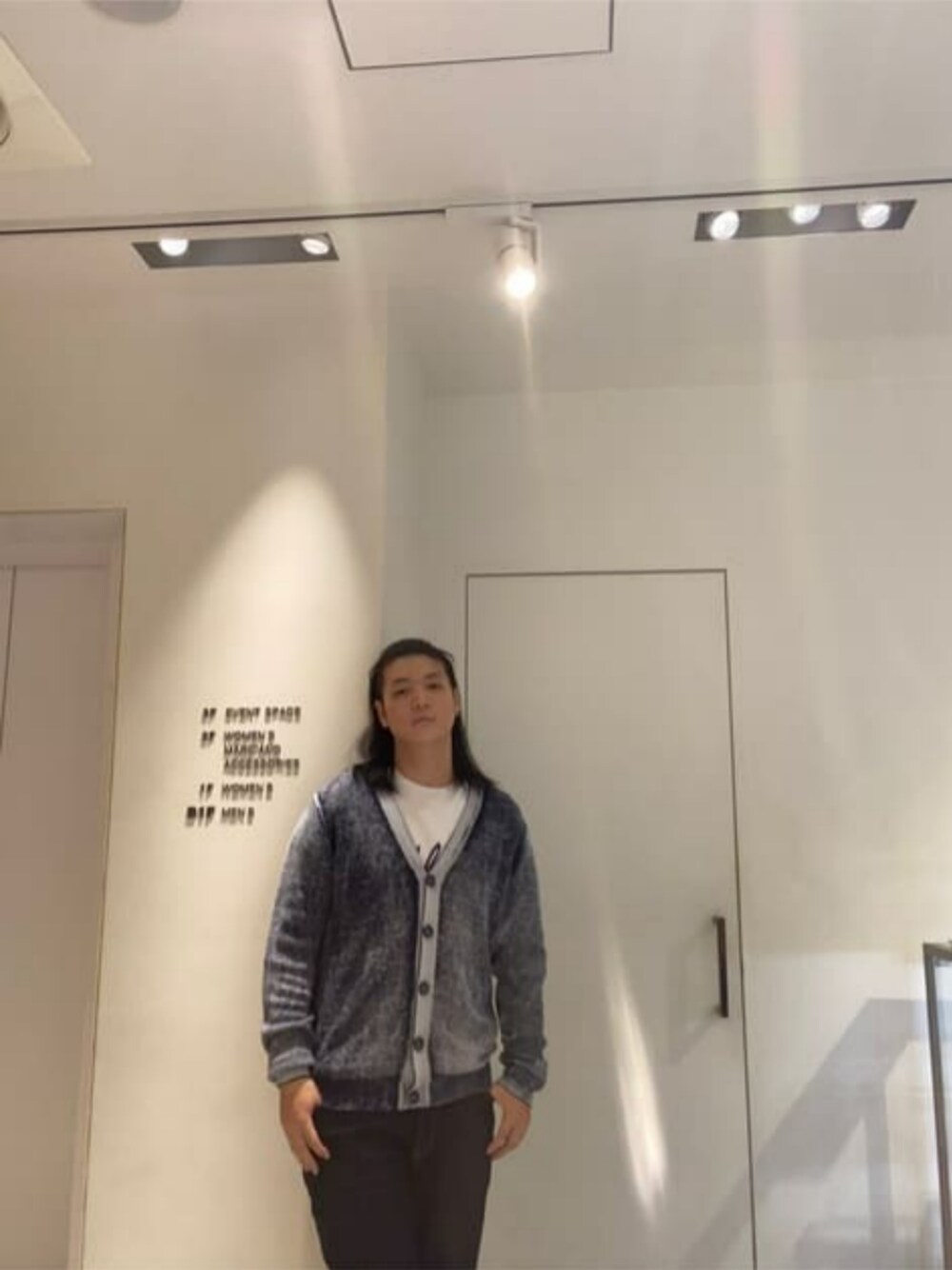 ニットカーディガンの色合いと 合わせたデニムパンツで 全体的に秋冬に向けた色となっております。