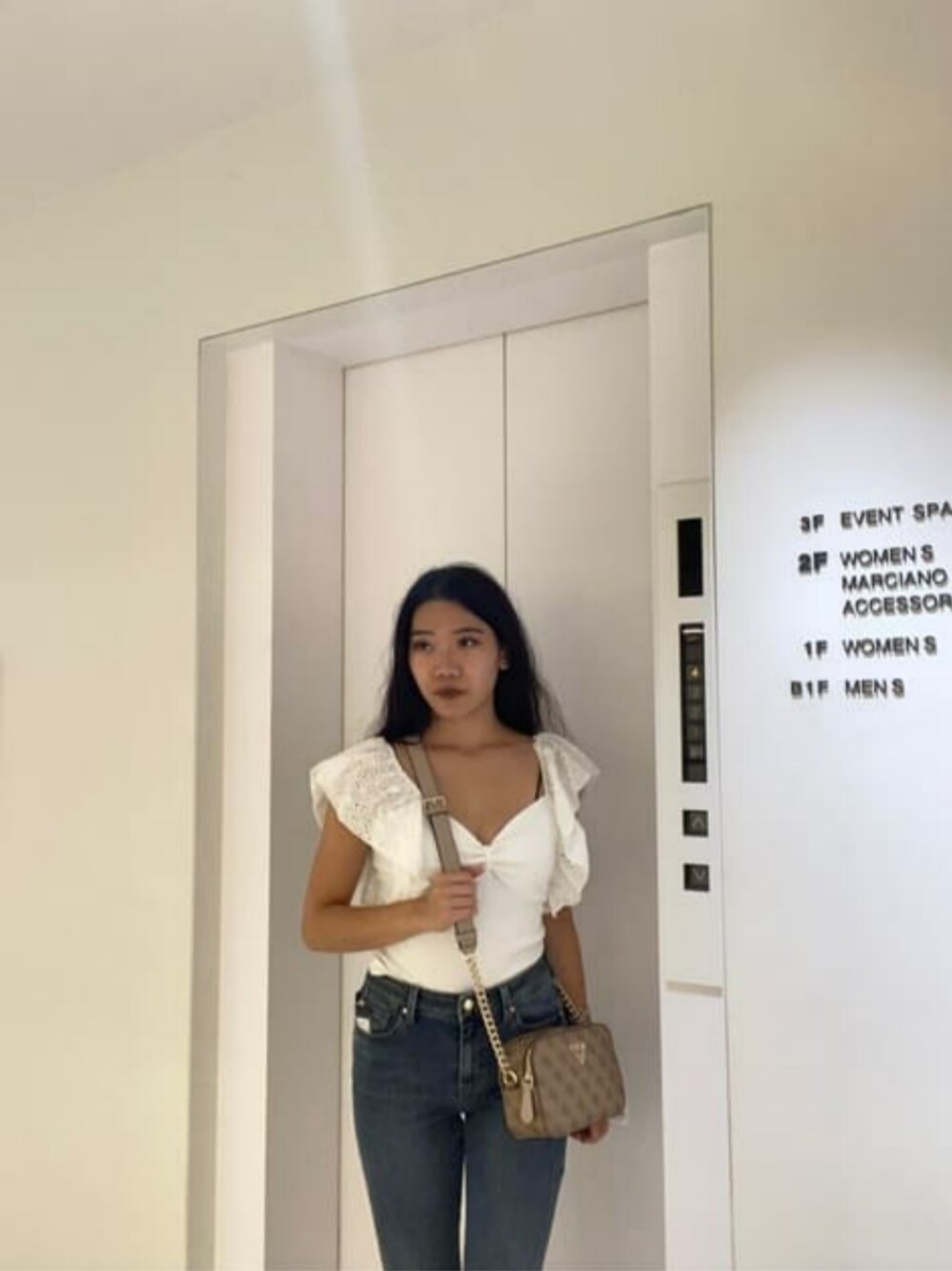 肩のフリルが女の子らしい雰囲気を出してくれるトップスです! デニムと合わせてシンプルコーデをしてみました!