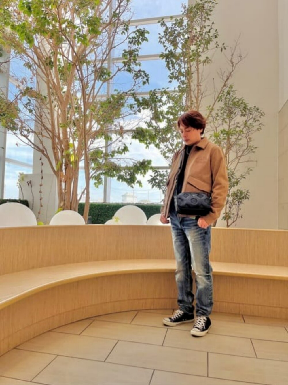 フェイクスエードのジャケットは 柔らかく着心地◎ デニムとニットでシンプルに合わせました。 Jacket : M Knit : M Denim : 29inch