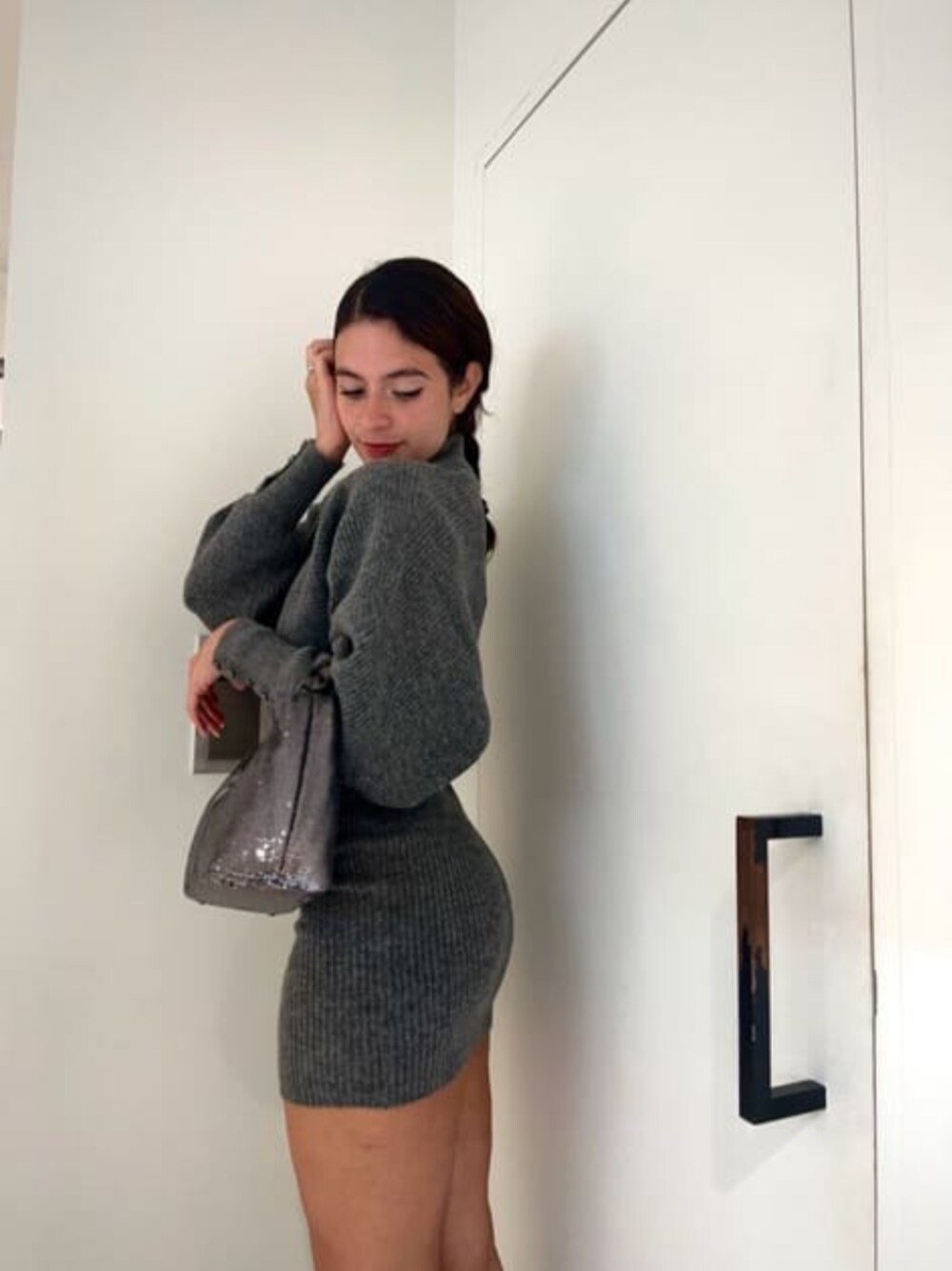 Tokyo capsuleの紹介❤︎ こちらはドレスとセーターを合わせてみました。 ドレスは体のラインをすごく綺麗に出してくれて半袖の作りなので上からセーターを羽織りゴージャスな雰囲気を出すことができます。 ハンドバッグはドレスの同じグレイの商品にして色の統一感で合わせてみました。 《着用サイズ》 セーター XS ドレス XS