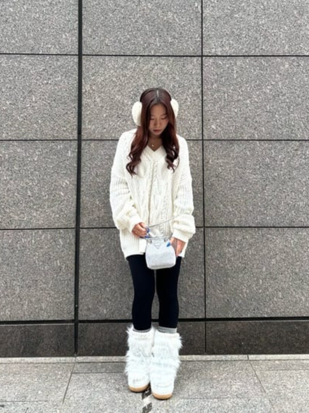 オーバーサイズのニットはワンピースとしてレギンスと合わせても可愛いです🩷 キラキラストーンバッグは動くたびにストーンがキラキラで可愛い🩷🩷🩷