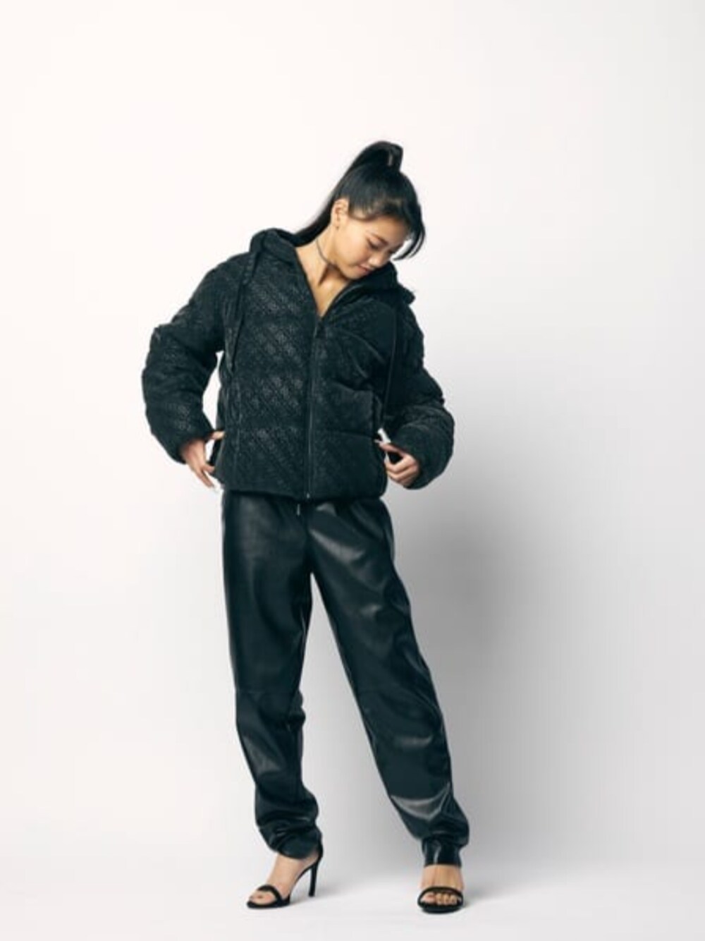 ブラックコーデ❤︎ クアトロGのロゴがかわいすぎるアウター!!!♡ フードの紐がベロアなのもポイント!!! レザーパンツはストレッチが効いていて動きやすい◎ 起毛素材なので保温力もばっちり!!!♡ 着用サイズ Outer,Pants 共に XS size