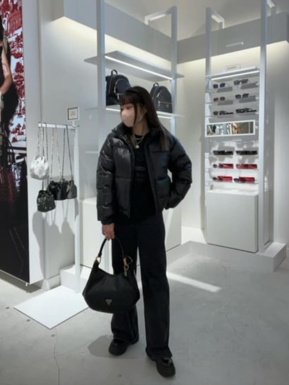 オールブラックでカッコよくして見ました! ダウンジャケットは、今年トレンドの光沢のある素材で、暖かさも十分です。 バックは、丸型のシンプルで、持つとおしゃれ感がアップできるバックです。