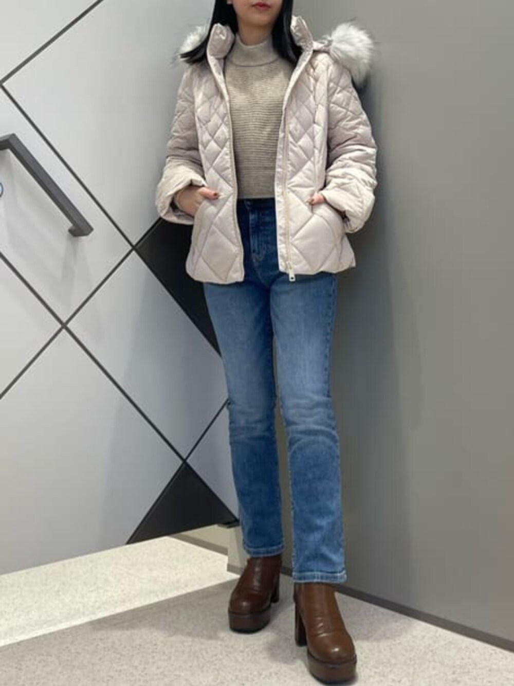 アウターにはダウンとフェザーが入っているので暖かいのにすごく軽い仕様です。 ウエストマークのベルトで着膨れせずにすっきりと着用できます! インナーに着ているトップスはバックスタイルがクロスしている珍しいデザイン。ドルマンスリーブでリラックスして着用できるのもポイントです!