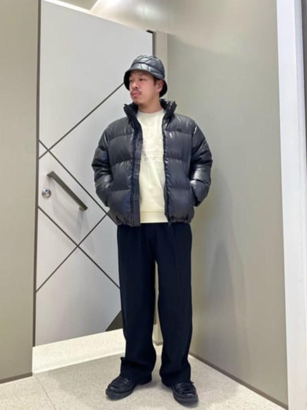 オールブラックコーデ! GUESSで珍しいメンズのタック入りワイドパンツは質感もフィット感も◎ ダウンジャケットと合わせて今着れる! 暖かコーデに^ ^