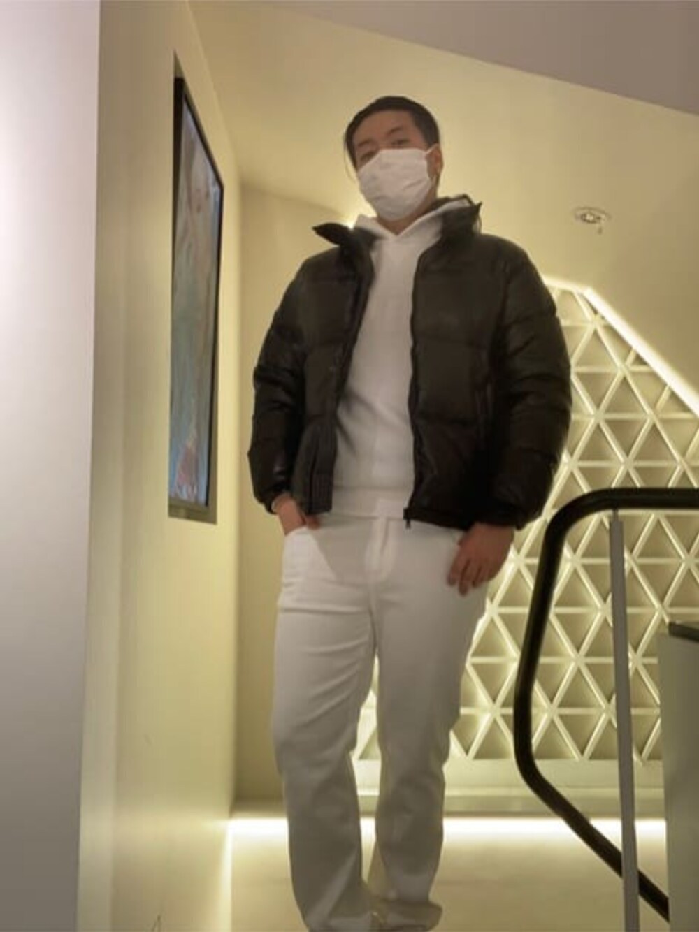 白のデニムに白のフーディーを 合わせセットアップ風にした上に リアルダウンのジャケットを 合わせたシンプルですが しっかりと決まるコーデとなっております。 フーディーはタイト目に着るのが ポイント