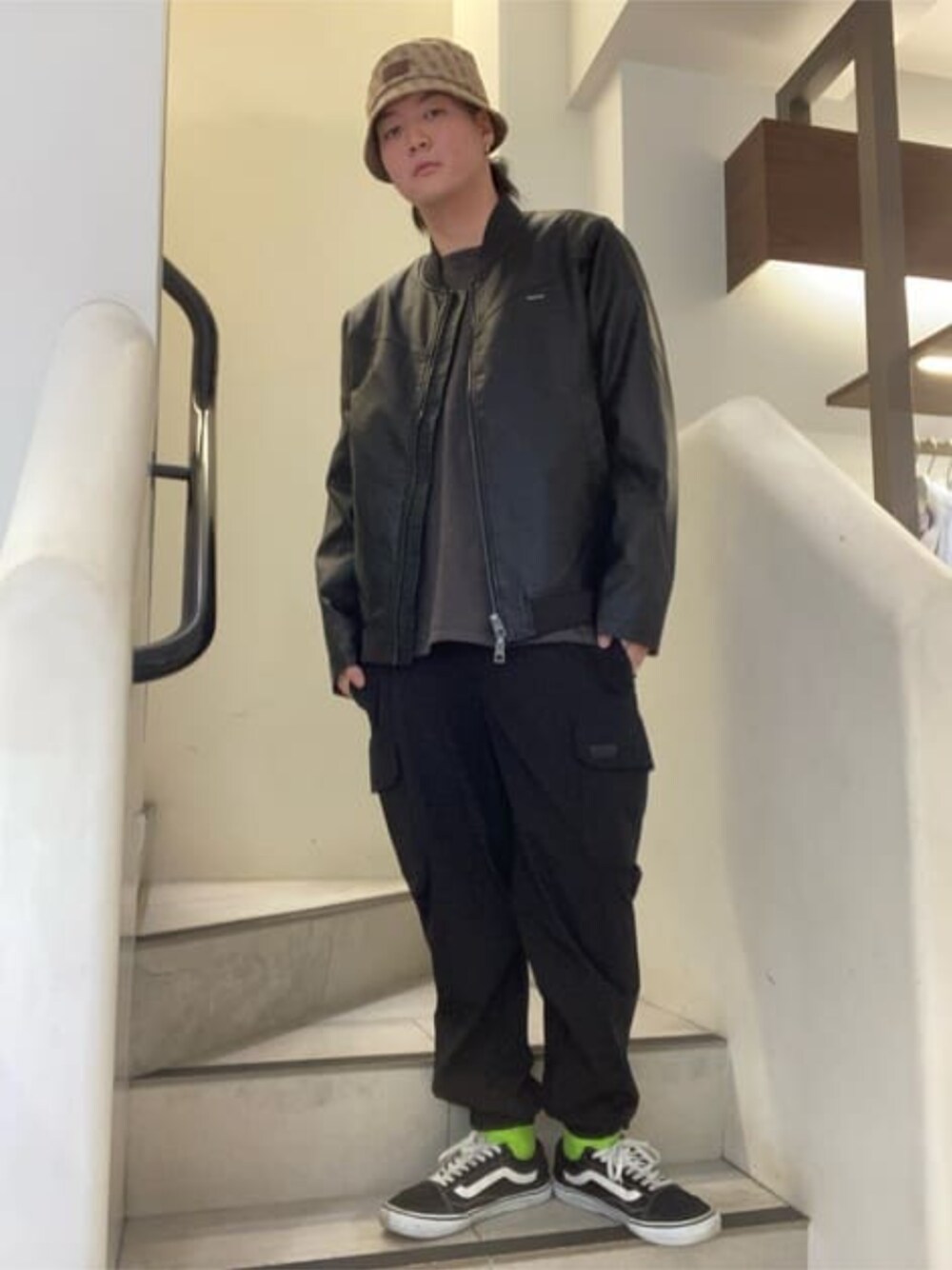 全体的に黒で落ち着きのある ファッションとなっております! その中に差し色でジャケットのプリントと ベージュのクワトロGのバケットハットを 合わせています。 まさにこれからのシーズンにピッタリの コーデとなっております!