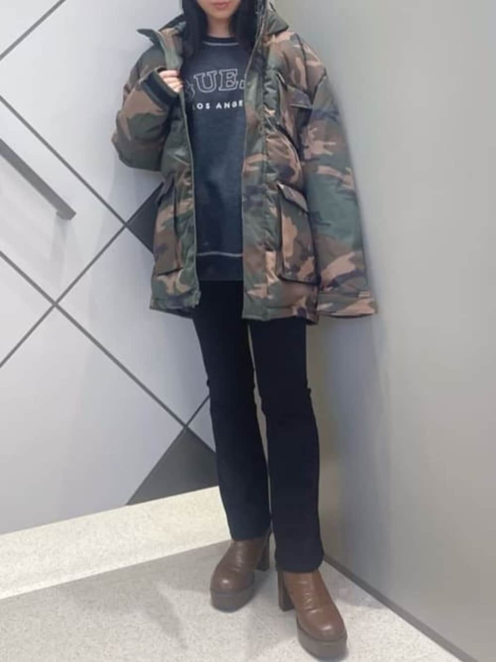 アウターはメンズのオーバーサイズのものを着用しているので、インナーとデニムはブラックですっきり見えるようにコーディネートしました。 インナーに着ているスウェットは厚手ではないので、春秋に1枚でも着用できるアイテムです!