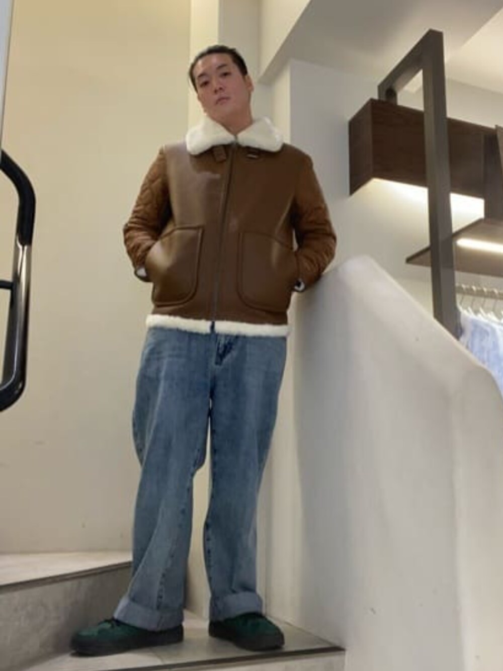 オーバーシルエットのデニムに ボアジャケットを合わせたコーデです! ジャケットは前後が違うデザインに なっており、見る角度によって違う イメージがあるのが面白いアイテムと なっております!