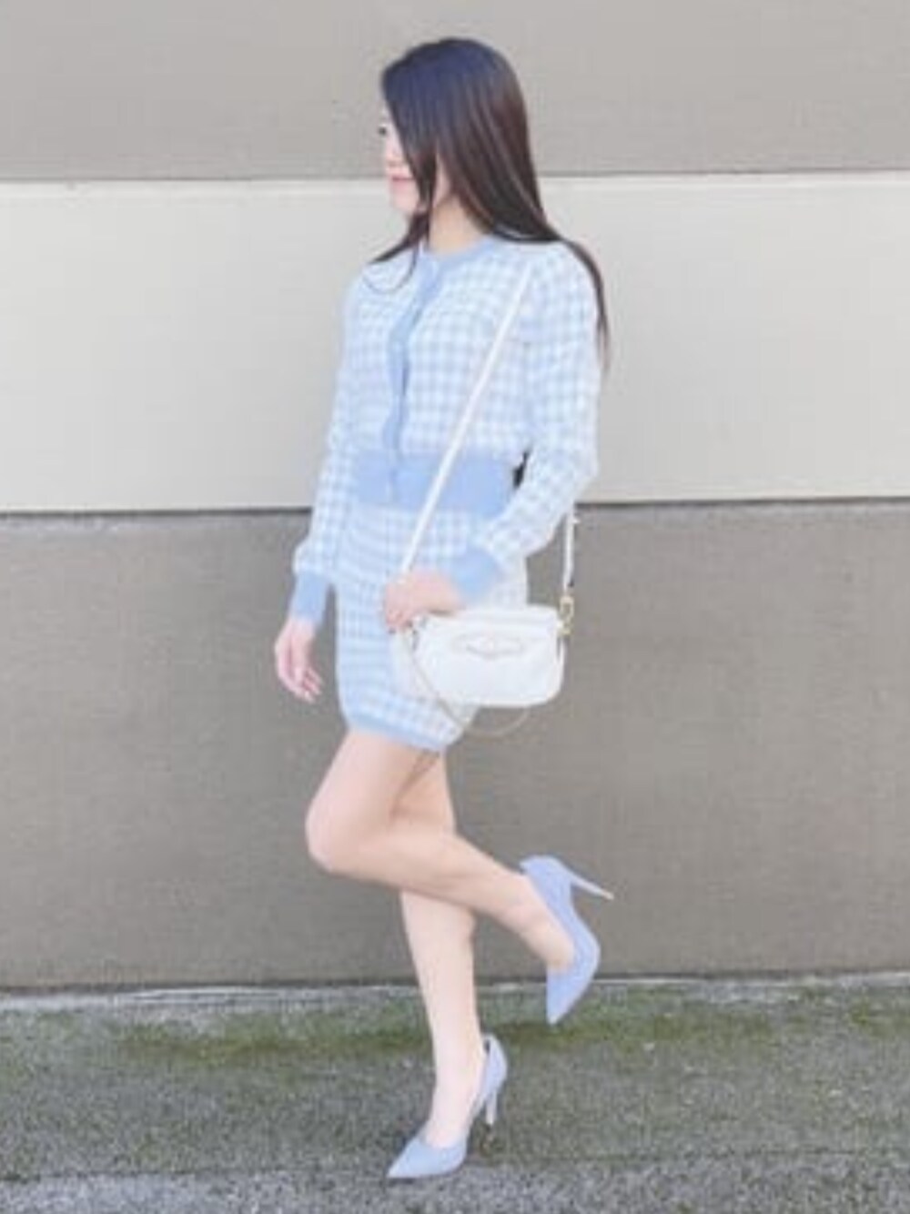 水色の千鳥柄可愛いデートコーデ♡♡ ニットのセットアップは触り心地もふわふわでストレッチ性も抜群!!! ストーンとパールのゴージャスなボタンがポイント♡♡♡ バッグゎ大人気の押し型のデザインでサイズ感が可愛い♡♡ ショルダーストラップや手前の小さなポーチは取り外しが可能な為、色々なコーディネートにお使い頂けます!!! 着用サイズ Tops,Skirt 共に XS size