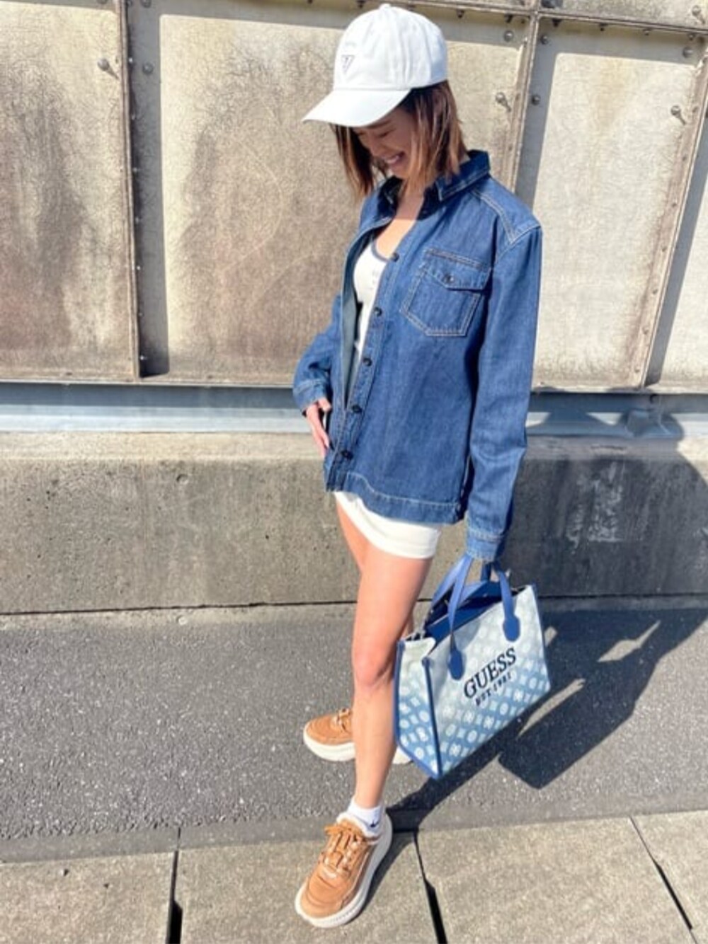 キャミワンピにデニムジャケットを合わせて春コーデ♫ 胸元のGUESSロゴがさりげなく可愛いスポーティーワンピースは伸縮性も高く動きやすいです(^^) スポーティーなコーデが好きな方は一枚持っていると重宝しますよ!