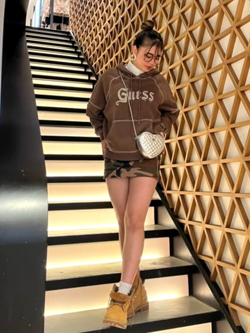 ブラウンコーデ♡ ブラウンのフーディから迷彩柄のミニスカが少し見えてるのがとてもかわいい☻ トップスは写真のbrownと、glayの2色あります!!! バックもハート型でとても可愛いです♡ どのアイテムも使い回ししやすいので是非⟡.·